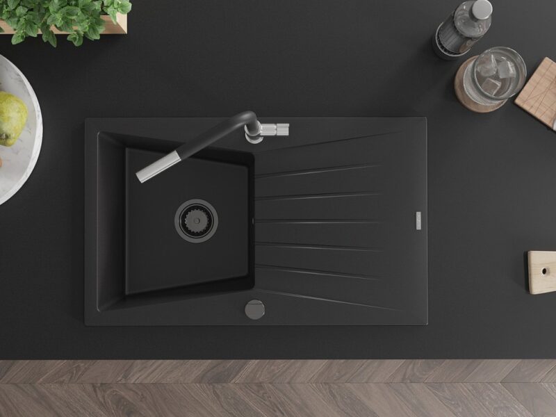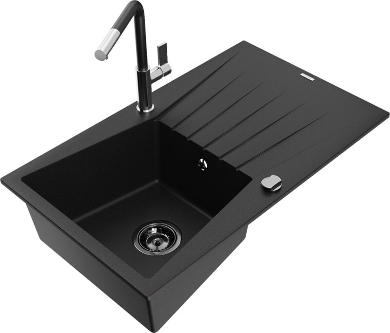 Technické dáta: drez: Rozmer: 775x470x200mm Hĺbka komory: 180 mm Rozmery komory: 410×355 mm Priemer odtoku: ø90 mm Typ: 1-miska s odkvapkávačom Typ: Zapustené do pracovnej dosky Čierna farba Povrchová úprava sifónu: čierna Materiál: žula (80% žulové kamenivo, 20% živice) Prepadový otvor: Áno Otvory: (batérie, automatické) 2 Inštalácia: Univerzálna, je možné inštalovať s odkvapkávačom na ľavú alebo pravú stranu Vysoká odolnosť proti poškriabaniu a zmene farby Odolnosť proti tepelným šokom Ľahko čistiteľný povrch kuchynská batéria: Materiál: mosadz Farba: chróm/čierna Hlava: Keramická Prevzdušňovač: Áno Typ: Jedna páka Rozsah výtoku: 245 mm Výška batérie: 307 mm(GT) Ean: 5905315061911