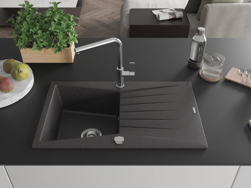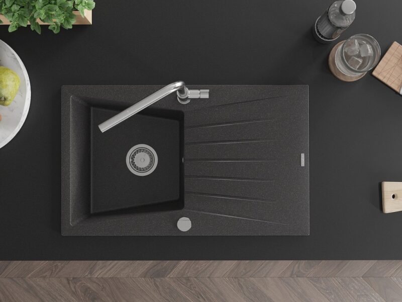 Technické dáta: drez: Rozmer: 775x470x200mm Hĺbka komory: 180 mm Rozmery komory: 410×355 mm Priemer odtoku: ø90 mm Typ: 1-miska s odkvapkávačom Typ: Zapustené do pracovnej dosky Farba: Škvrnitá čierna Povrchová úprava sifónu: Chrome Materiál: žula (80% žulové kamenivo, 20% živice) Prepadový otvor: Áno Otvory: (batérie, automatické) 2 Inštalácia: Univerzálna, je možné inštalovať s odkvapkávačom na ľavú alebo pravú stranu Vysoká odolnosť proti poškriabaniu a zmene farby Odolnosť proti tepelným šokom Ľahko čistiteľný povrch kuchynská batéria: Materiál: mosadz Farba: Chrome Hlava: Keramická Prevzdušňovač: Áno Typ: Jedna páka Rozsah výtoku: 245 mm Výška batérie: 307 mm(GT) Ean: 5905315061799
