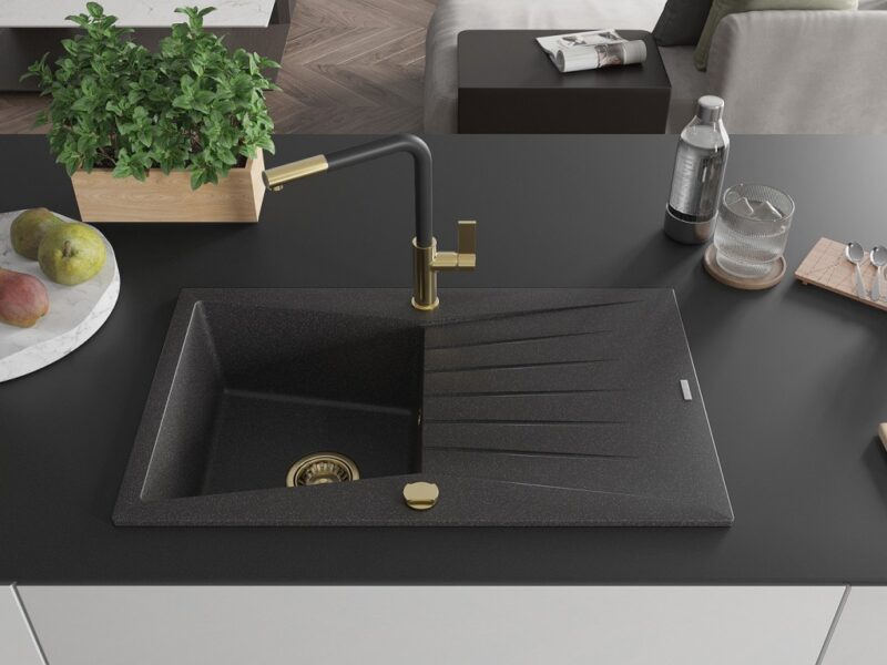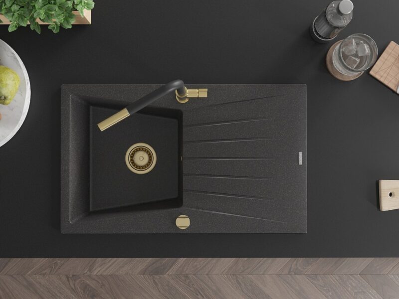Technické dáta: drez: Rozmer: 775x470x200mm Hĺbka komory: 180 mm Rozmery komory: 410×355 mm Priemer odtoku: ø90 mm Typ: 1-miska s odkvapkávačom Typ: Zapustené do pracovnej dosky Farba: Škvrnitá čierna Povrchová úprava sifónu: zlatá Materiál: žula (80% žulové kamenivo, 20% živice) Prepadový otvor: Áno Otvory: (batérie, automatické) 2 Inštalácia: Univerzálna, je možné inštalovať s odkvapkávačom na ľavú alebo pravú stranu Vysoká odolnosť proti poškriabaniu a zmene farby Odolnosť proti tepelným šokom Ľahko čistiteľný povrch kuchynská batéria: Materiál: mosadz Farba: Zlatá/Čierna Hlava: Keramická Prevzdušňovač: Áno Typ: Jedna páka Rozsah výtoku: 245 mm Výška batérie: 307 mm(GT) Ean: 5905315061843