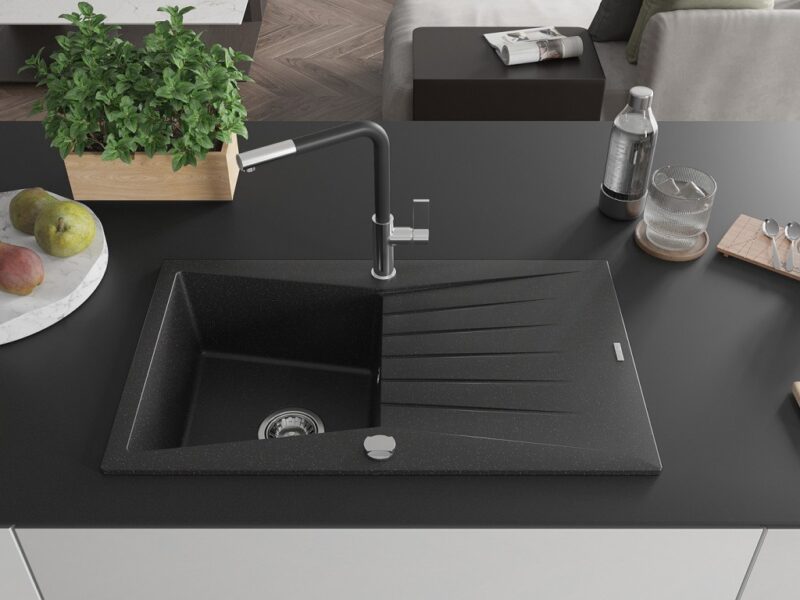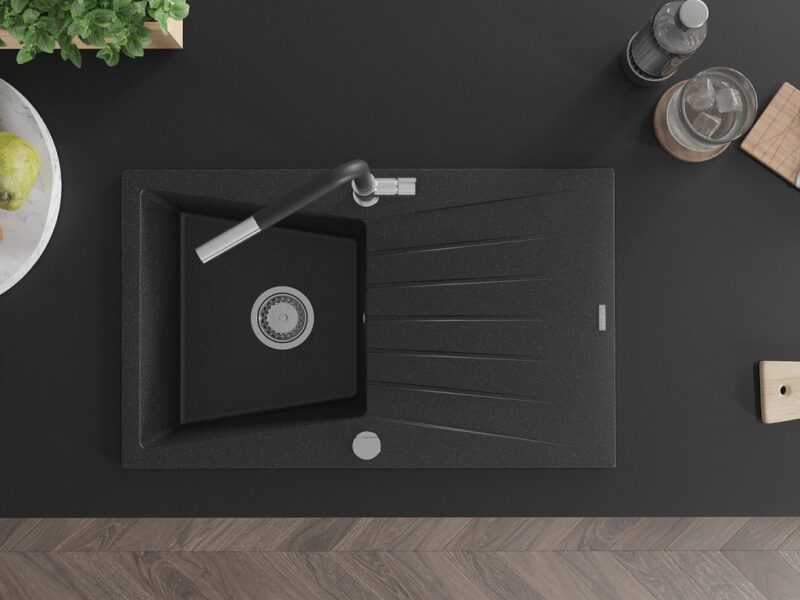 Technické dáta: drez: Rozmer: 775x470x200mm Hĺbka komory: 180 mm Rozmery komory: 410×355 mm Priemer odtoku: ø90 mm Typ: 1-miska s odkvapkávačom Typ: Zapustené do pracovnej dosky Farba: čierna/strieborná metalíza Povrchová úprava sifónu: Chrome Materiál: žula (80% žulové kamenivo, 20% živice) Prepadový otvor: Áno Otvory: (batérie, automatické) 2 Inštalácia: Univerzálna, je možné inštalovať s odkvapkávačom na ľavú alebo pravú stranu Vysoká odolnosť proti poškriabaniu a zmene farby Odolnosť proti tepelným šokom Ľahko čistiteľný povrch kuchynská batéria: Materiál: mosadz Farba: chróm/čierna Hlava: Keramická Prevzdušňovač: Áno Typ: Jedna páka Rozsah výtoku: 245 mm Výška batérie: 307 mm(GT) Ean: 5905315061683