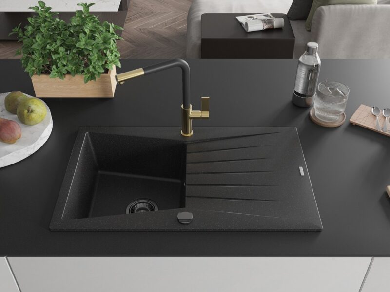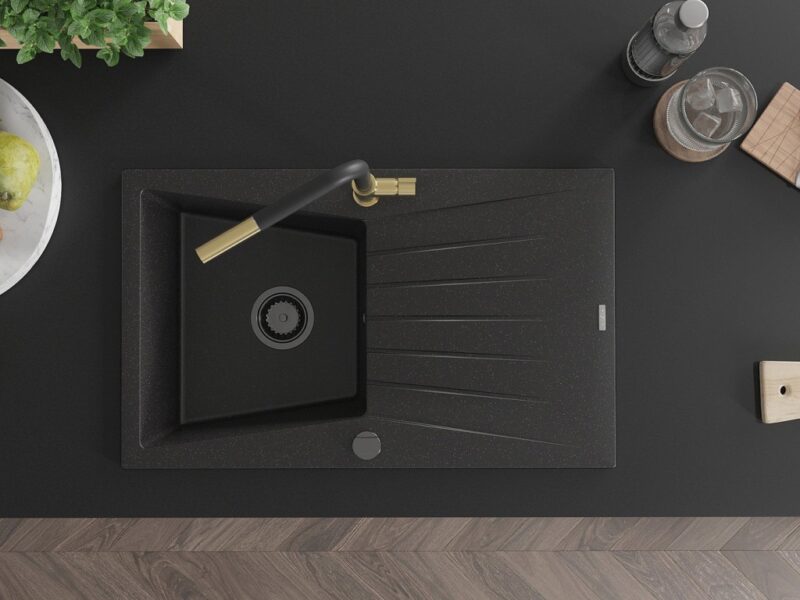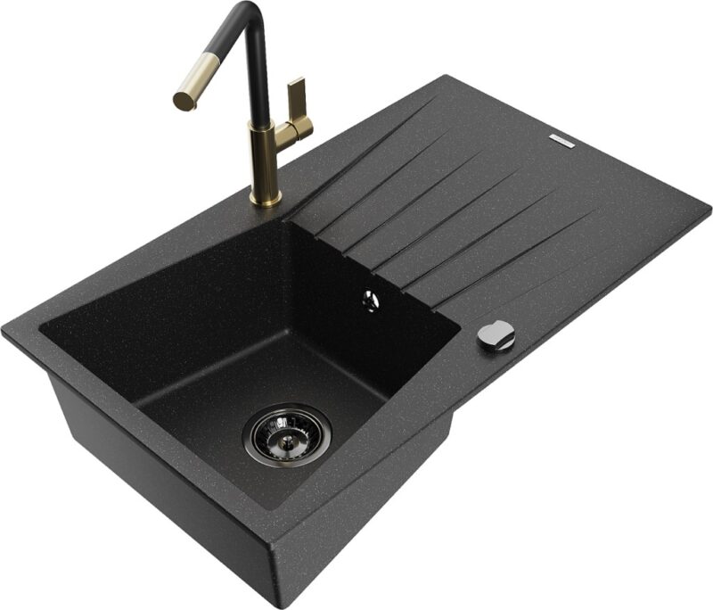 Technické dáta: drez: Rozmer: 775x470x200mm Hĺbka komory: 180 mm Rozmery komory: 410×355 mm Priemer odtoku: ø90 mm Typ: 1-miska s odkvapkávačom Typ: Zapustené do pracovnej dosky Farba: čierna/strieborná metalíza Povrchová úprava sifónu: čierna Materiál: žula (80% žulové kamenivo, 20% živice) Prepadový otvor: Áno Otvory: (batérie, automatické) 2 Inštalácia: Univerzálna, je možné inštalovať s odkvapkávačom na ľavú alebo pravú stranu Vysoká odolnosť proti poškriabaniu a zmene farby Odolnosť proti tepelným šokom Ľahko čistiteľný povrch kuchynská batéria: Materiál: mosadz Farba: Zlatá/Čierna Hlava: Keramická Prevzdušňovač: Áno Typ: Jedna páka Rozsah výtoku: 245 mm Výška batérie: 307 mm(GT) Ean: 5905315061713