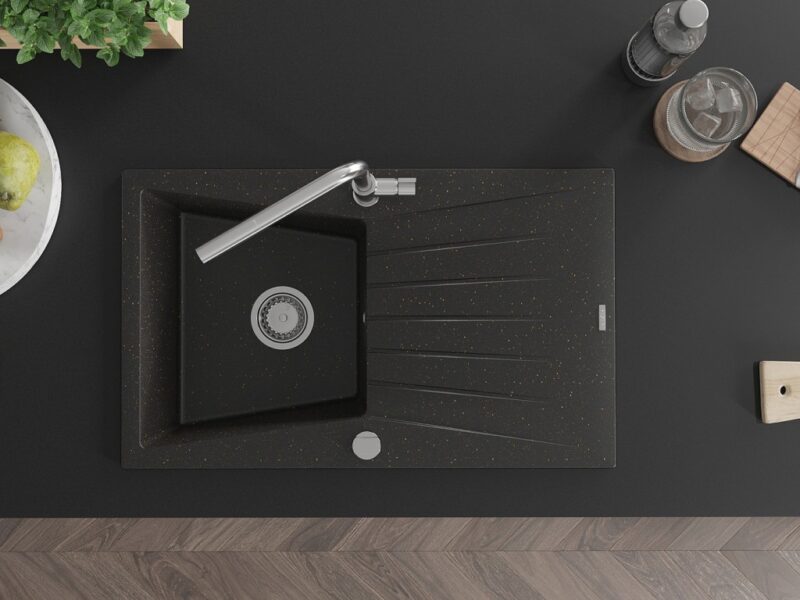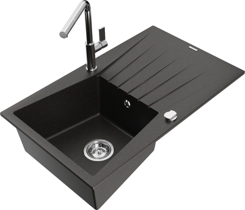 Technické dáta: drez: Rozmer: 775x470x200mm Hĺbka komory: 180 mm Rozmery komory: 410×355 mm Priemer odtoku: ø90 mm Typ: 1-miska s odkvapkávačom Typ: Zapustené do pracovnej dosky Farba: čierna / zlatá metalíza Povrchová úprava sifónu: Chrome Materiál: žula (80% žulové kamenivo, 20% živice) Prepadový otvor: Áno Otvory: (batérie, automatické) 2 Inštalácia: Univerzálna, je možné inštalovať s odkvapkávačom na ľavú alebo pravú stranu Vysoká odolnosť proti poškriabaniu a zmene farby Odolnosť proti tepelným šokom Ľahko čistiteľný povrch kuchynská batéria: Materiál: mosadz Farba: Chrome Hlava: Keramická Prevzdušňovač: Áno Typ: Jedna páka Rozsah výtoku: 245 mm Výška batérie: 307 mm(GT) Ean: 5905315061737