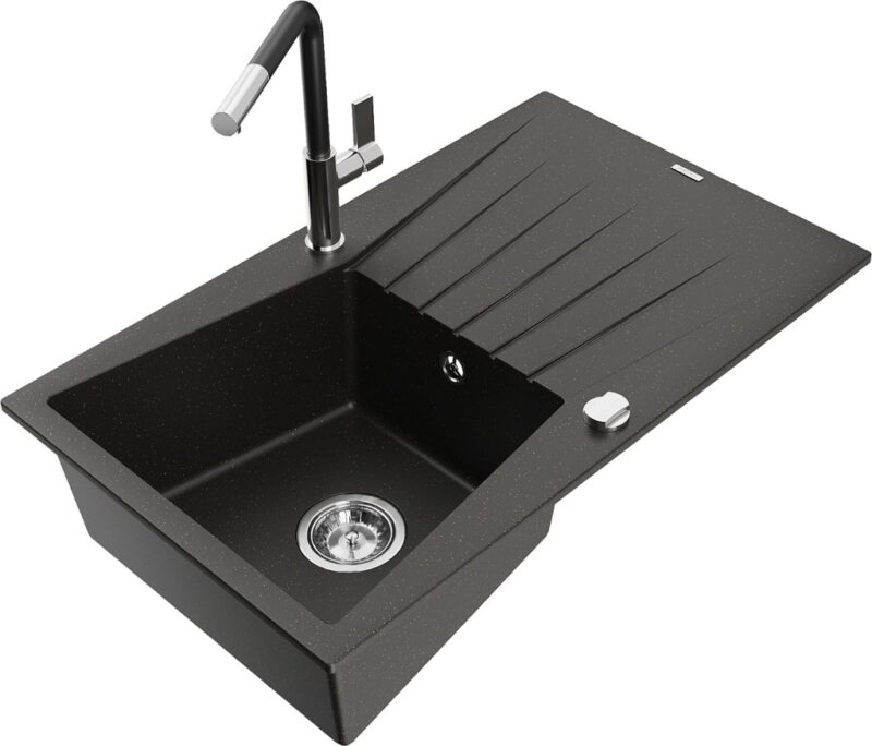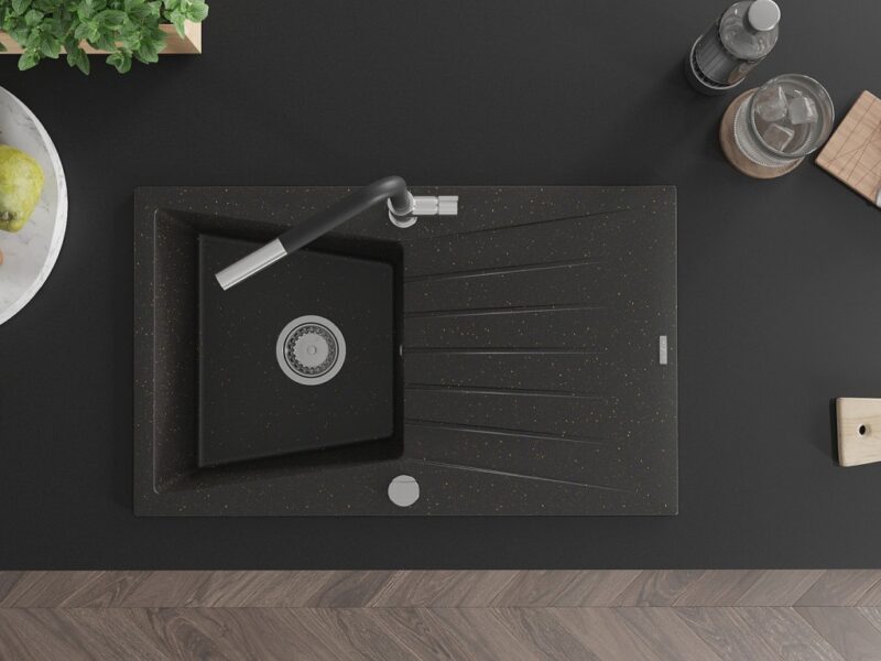 Technické dáta: drez: Rozmer: 775x470x200mm Hĺbka komory: 180 mm Rozmery komory: 410×355 mm Priemer odtoku: ø90 mm Typ: 1-miska s odkvapkávačom Typ: Zapustené do pracovnej dosky Farba: čierna / zlatá metalíza Povrchová úprava sifónu: Chrome Materiál: žula (80% žulové kamenivo, 20% živice) Prepadový otvor: Áno Otvory: (batérie, automatické) 2 Inštalácia: Univerzálna, je možné inštalovať s odkvapkávačom na ľavú alebo pravú stranu Vysoká odolnosť proti poškriabaniu a zmene farby Odolnosť proti tepelným šokom Ľahko čistiteľný povrch kuchynská batéria: Materiál: mosadz Farba: chróm/čierna Hlava: Keramická Prevzdušňovač: Áno Typ: Jedna páka Rozsah výtoku: 245 mm Výška batérie: 307 mm(GT) Ean: 5905315061744