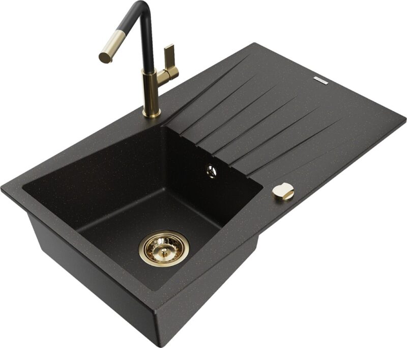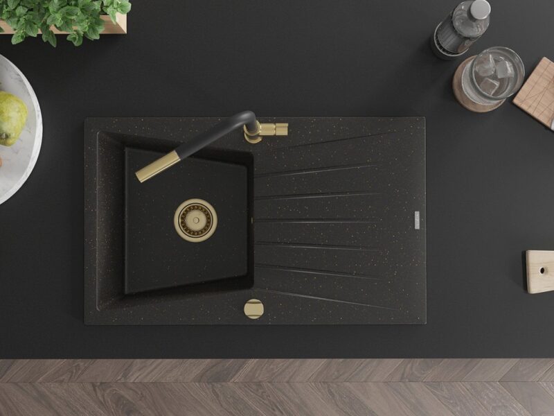 Technické dáta: drez: Rozmer: 775x470x200mm Hĺbka komory: 180 mm Rozmery komory: 410×355 mm Priemer odtoku: ø90 mm Typ: 1-miska s odkvapkávačom Typ: Zapustené do pracovnej dosky Farba: čierna / zlatá metalíza Povrchová úprava sifónu: zlatá Materiál: žula (80% žulové kamenivo, 20% živice) Prepadový otvor: Áno Otvory: (batérie, automatické) 2 Inštalácia: Univerzálna, je možné inštalovať s odkvapkávačom na ľavú alebo pravú stranu Vysoká odolnosť proti poškriabaniu a zmene farby Odolnosť proti tepelným šokom Ľahko čistiteľný povrch kuchynská batéria: Materiál: mosadz Farba: Zlatá/Čierna Hlava: Keramická Prevzdušňovač: Áno Typ: Jedna páka Rozsah výtoku: 245 mm Výška batérie: 307 mm(GT) Ean: 5905315061768