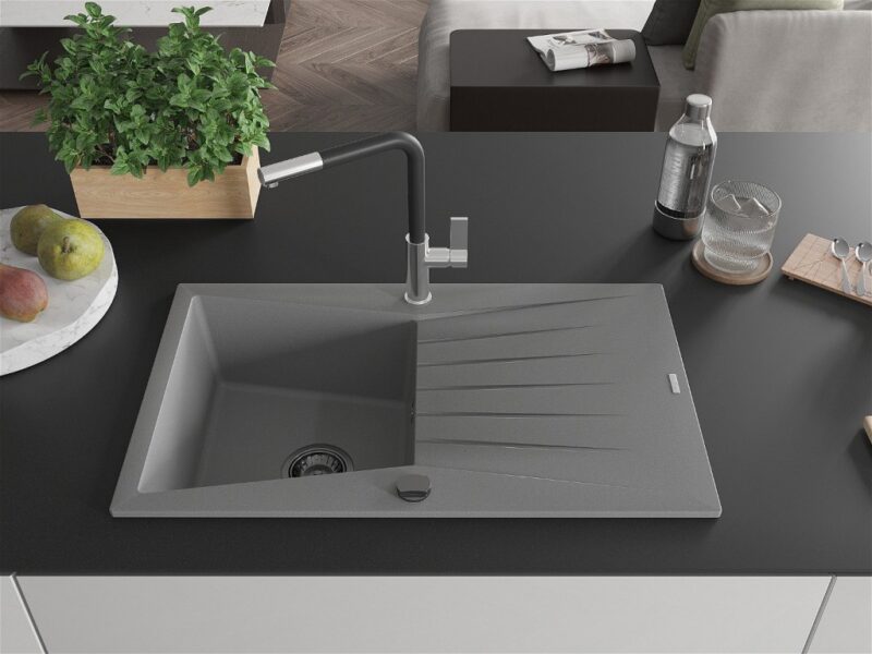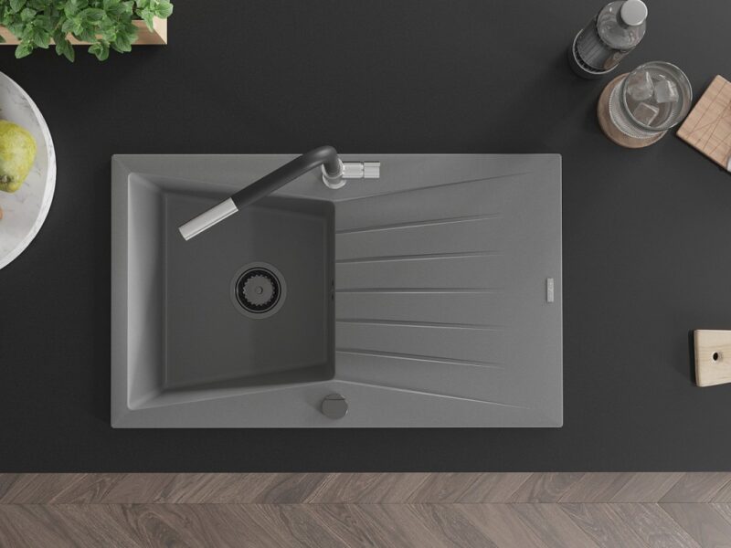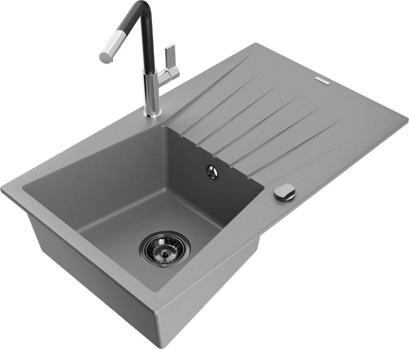 Technické dáta: drez: Rozmer: 775x470x200mm Hĺbka komory: 180 mm Rozmery komory: 410×355 mm Priemer odtoku: ø90 mm Typ: 1-miska s odkvapkávačom Typ: Zapustené do pracovnej dosky Šedá farba Povrchová úprava sifónu: čierna Materiál: žula (80% žulové kamenivo, 20% živice) Prepadový otvor: Áno Otvory: (batérie, automatické) 2 Inštalácia: Univerzálna, je možné inštalovať s odkvapkávačom na ľavú alebo pravú stranu Vysoká odolnosť proti poškriabaniu a zmene farby Odolnosť proti tepelným šokom Ľahko čistiteľný povrch kuchynská batéria: Materiál: mosadz Farba: chróm/čierna Hlava: Keramická Prevzdušňovač: Áno Typ: Jedna páka Rozsah výtoku: 245 mm Výška batérie: 307 mm(GT) Ean: 5905315061638
