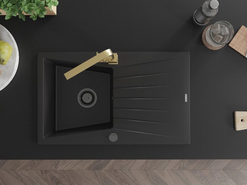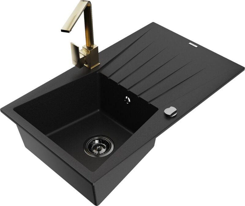 Technické dáta: drez: Rozmer: 775x470x200mm Hĺbka komory: 180 mm Rozmery komory: 410×355 mm Priemer odtoku: ø90 mm Typ: 1-miska s odkvapkávačom Typ: Zapustené do pracovnej dosky Čierna farba Povrchová úprava sifónu: čierna Materiál: žula (80% žulové kamenivo, 20% živice) Prepadový otvor: Áno Otvory: (batérie, automatické) 2 Inštalácia: Univerzálna, je možné inštalovať s odkvapkávačom na ľavú alebo pravú stranu Vysoká odolnosť proti poškriabaniu a zmene farby Odolnosť proti tepelným šokom Ľahko čistiteľný povrch kuchynská batéria: Materiál: mosadz Farba: Zlatá Hlava: Keramická Prevzdušňovač: Áno Typ: Jedna páka Výška batérie: 290 mm Rozsah výtoku: 220 mm(GT) Ean: 5905315020703