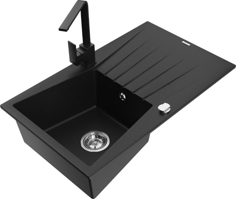Technické dáta: drez: Rozmer: 775x470x200mm Hĺbka komory: 180 mm Rozmery komory: 410×355 mm Priemer odtoku: ø90 mm Typ: 1-miska s odkvapkávačom Typ: Zapustené do pracovnej dosky Čierna farba Povrchová úprava sifónu: Chrome Materiál: žula (80% žulové kamenivo, 20% živice) Prepadový otvor: Áno Otvory: (batérie, automatické) 2 Inštalácia: Univerzálna, je možné inštalovať s odkvapkávačom na ľavú alebo pravú stranu Vysoká odolnosť proti poškriabaniu a zmene farby Odolnosť proti tepelným šokom Ľahko čistiteľný povrch kuchynská batéria: Materiál: mosadz Čierna farba Hlava: Keramická Prevzdušňovač: Áno Typ: Jedna páka Výška batérie: 300 mm(GT) Ean: 5905315020727