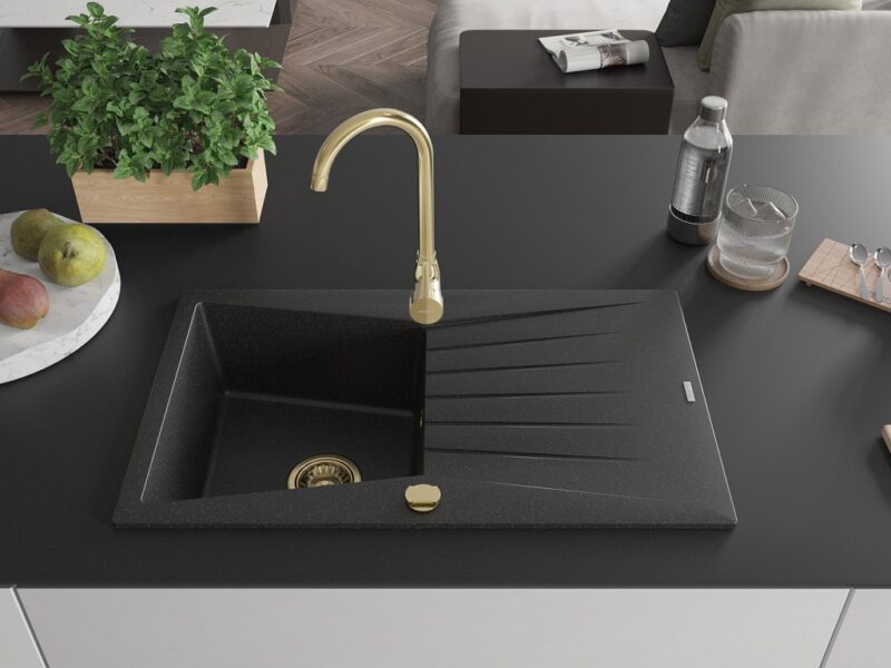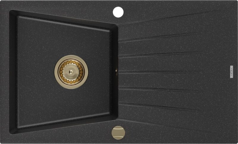 MEXEN/S MEXEN/S – Cesar granitový drez 1 s odkvapkávačom 775×470 mm, čierny/striebro metalík + zlatý sifón 6514771010-73-G