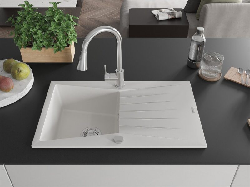 Technické dáta: drez: Rozmer: 775x470x200mm Hĺbka komory: 180 mm Rozmery komory: 410×355 mm Priemer odtoku: ø90 mm Typ: 1-miska s odkvapkávačom Typ: Zapustené do pracovnej dosky biela farba Povrchová úprava sifónu: Chrome Materiál: žula (80% žulové kamenivo, 20% živice) Prepadový otvor: Áno Otvory: (batérie, automatické) 2 Inštalácia: Univerzálna, je možné inštalovať s odkvapkávačom na ľavú alebo pravú stranu Vysoká odolnosť proti poškriabaniu a zmene farby Odolnosť proti tepelným šokom Ľahko čistiteľný povrch kuchynská batéria: Materiál: mosadz Farba: Chrome Hlava: Keramická Prevzdušňovač: Áno Typ: Jedna páka Výška batérie: 380 mm Rozsah výtoku: 252 mm Typ výtoku: Výsuvný(GT) Ean: 5905315030658