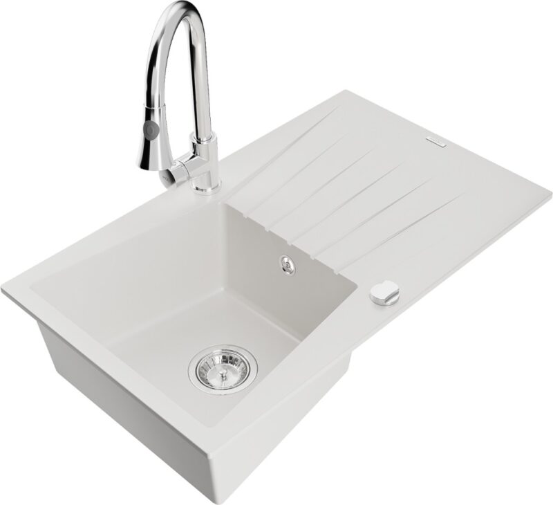 MEXEN/S MEXEN/S – Cesar granitový drez 1 s odkvapkávačom vrátane batérie Elia, biela 6514-20-670101-00