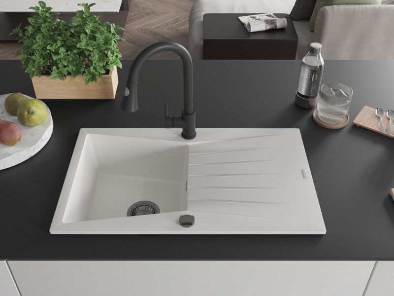 Technické dáta: drez: Rozmer: 775x470x200mm Hĺbka komory: 180 mm Rozmery komory: 410×355 mm Priemer odtoku: ø90 mm Typ: 1-miska s odkvapkávačom Typ: Zapustené do pracovnej dosky biela farba Povrchová úprava sifónu: čierna Materiál: žula (80% žulové kamenivo, 20% živice) Prepadový otvor: Áno Otvory: (batérie, automatické) 2 Inštalácia: Univerzálna, je možné inštalovať s odkvapkávačom na ľavú alebo pravú stranu Vysoká odolnosť proti poškriabaniu a zmene farby Odolnosť proti tepelným šokom Ľahko čistiteľný povrch kuchynská batéria: Materiál: mosadz Čierna farba Hlava: Keramická Prevzdušňovač: Áno Typ: Jedna páka Výška batérie: 380 mm Rozsah výtoku: 252 mm Typ výtoku: Výsuvný(GT) Ean: 5905315030689