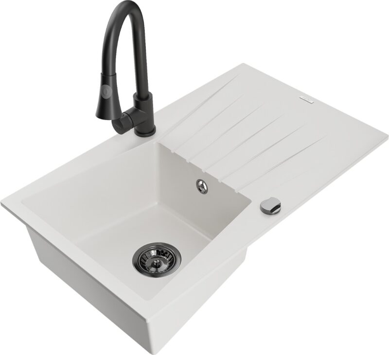 MEXEN/S MEXEN/S – Cesar granitový drez 1 s odkvapkávačom vrátane batérie Elia, biela 6514-20-670101-70
