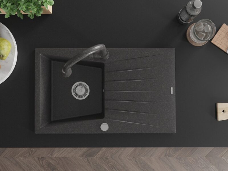 Technické dáta: drez: Rozmer: 775x470x200mm Hĺbka komory: 180 mm Rozmery komory: 410×355 mm Priemer odtoku: ø90 mm Typ: 1-miska s odkvapkávačom Typ: Zapustené do pracovnej dosky Farba: Škvrnitá čierna Povrchová úprava sifónu: Chrome Materiál: žula (80% žulové kamenivo, 20% živice) Prepadový otvor: Áno Otvory: (batérie, automatické) 2 Inštalácia: Univerzálna, je možné inštalovať s odkvapkávačom na ľavú alebo pravú stranu Vysoká odolnosť proti poškriabaniu a zmene farby Odolnosť proti tepelným šokom Ľahko čistiteľný povrch kuchynská batéria: Materiál: mosadz Farba: Škvrnitá čierna Hlava: Keramická Prevzdušňovač: Áno Typ: Jedna páka Výška batérie: 380 mm Rozsah výtoku: 252 mm Typ výtoku: Výsuvný(GT) Ean: 5905315030917
