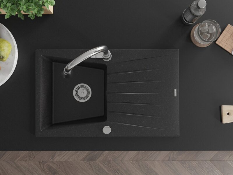 Technické dáta: drez: Rozmer: 775x470x200mm Hĺbka komory: 180 mm Rozmery komory: 410×355 mm Priemer odtoku: ø90 mm Typ: 1-miska s odkvapkávačom Typ: Zapustené do pracovnej dosky Farba: čierna/strieborná metalíza Povrchová úprava sifónu: Chrome Materiál: žula (80% žulové kamenivo, 20% živice) Prepadový otvor: Áno Otvory: (batérie, automatické) 2 Inštalácia: Univerzálna, je možné inštalovať s odkvapkávačom na ľavú alebo pravú stranu Vysoká odolnosť proti poškriabaniu a zmene farby Odolnosť proti tepelným šokom Ľahko čistiteľný povrch kuchynská batéria: Materiál: mosadz Farba: Chrome Hlava: Keramická Prevzdušňovač: Áno Typ: Jedna páka Výška batérie: 380 mm Rozsah výtoku: 252 mm Typ výtoku: Výsuvný(GT) Ean: 5905315030788