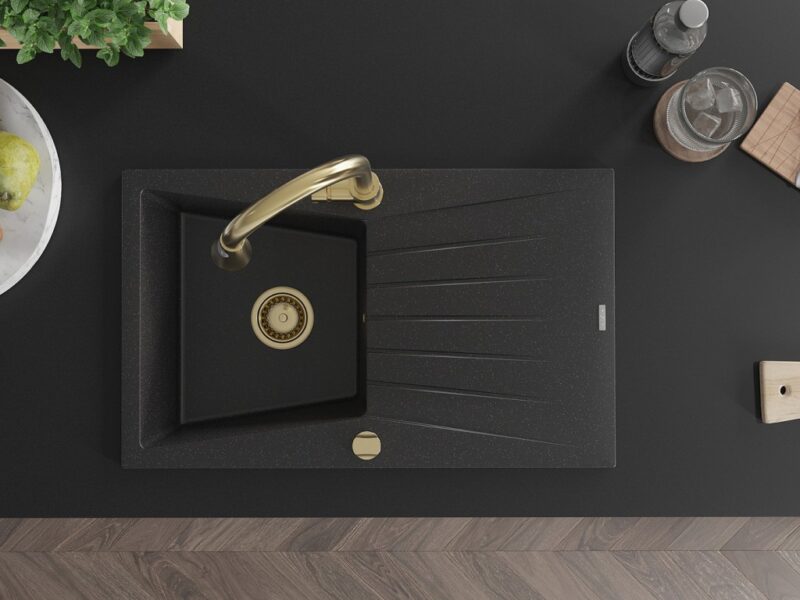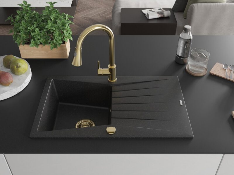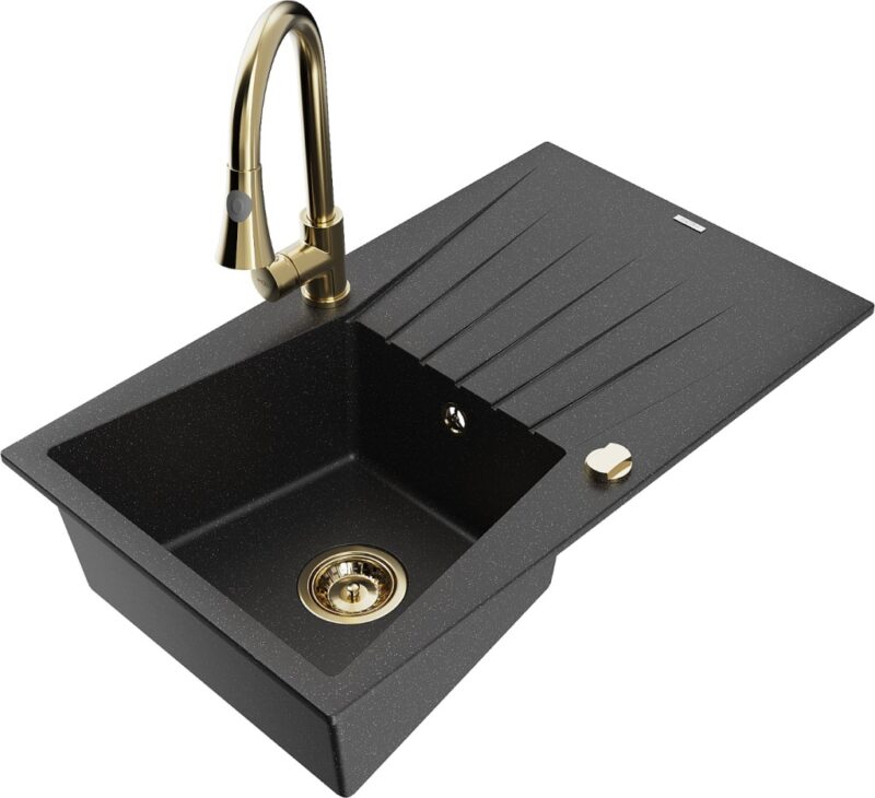 Technické dáta: drez: Rozmer: 775x470x200mm Hĺbka komory: 180 mm Rozmery komory: 410×355 mm Priemer odtoku: ø90 mm Typ: 1-miska s odkvapkávačom Typ: Zapustené do pracovnej dosky Farba: čierna/strieborná metalíza Povrchová úprava sifónu: zlatá Materiál: žula (80% žulové kamenivo, 20% živice) Prepadový otvor: Áno Otvory: (batérie, automatické) 2 Inštalácia: Univerzálna, je možné inštalovať s odkvapkávačom na ľavú alebo pravú stranu Vysoká odolnosť proti poškriabaniu a zmene farby Odolnosť proti tepelným šokom Ľahko čistiteľný povrch kuchynská batéria: Materiál: mosadz Farba: Zlatá Hlava: Keramická Prevzdušňovač: Áno Typ: Jedna páka Výška batérie: 380 mm Rozsah výtoku: 252 mm Typ výtoku: Výsuvný(GT) Ean: 5905315030795