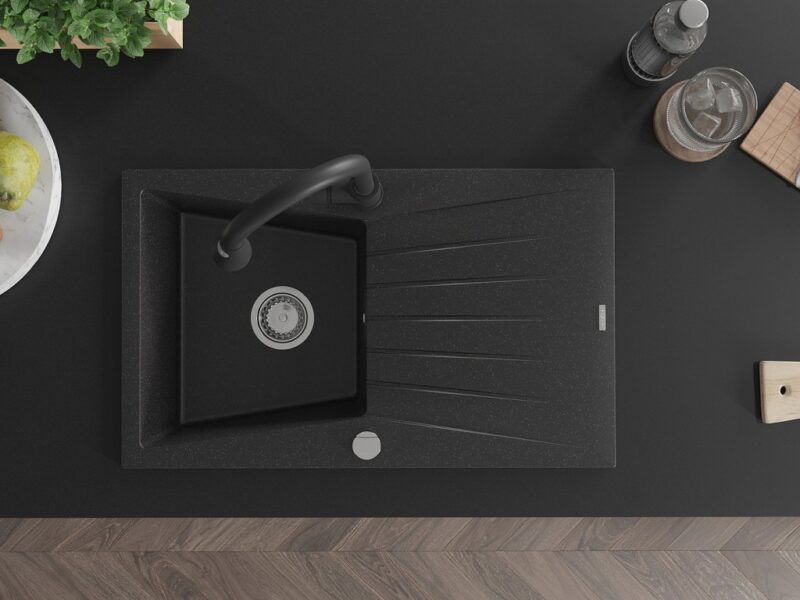 Technické dáta: drez: Rozmer: 775x470x200mm Hĺbka komory: 180 mm Rozmery komory: 410×355 mm Priemer odtoku: ø90 mm Typ: 1-miska s odkvapkávačom Typ: Zapustené do pracovnej dosky Farba: čierna/strieborná metalíza Povrchová úprava sifónu: Chrome Materiál: žula (80% žulové kamenivo, 20% živice) Prepadový otvor: Áno Otvory: (batérie, automatické) 2 Inštalácia: Univerzálna, je možné inštalovať s odkvapkávačom na ľavú alebo pravú stranu Vysoká odolnosť proti poškriabaniu a zmene farby Odolnosť proti tepelným šokom Ľahko čistiteľný povrch kuchynská batéria: Materiál: mosadz Čierna farba Hlava: Keramická Prevzdušňovač: Áno Typ: Jedna páka Výška batérie: 380 mm Rozsah výtoku: 252 mm Typ výtoku: Výsuvný(GT) Ean: 5905315030818