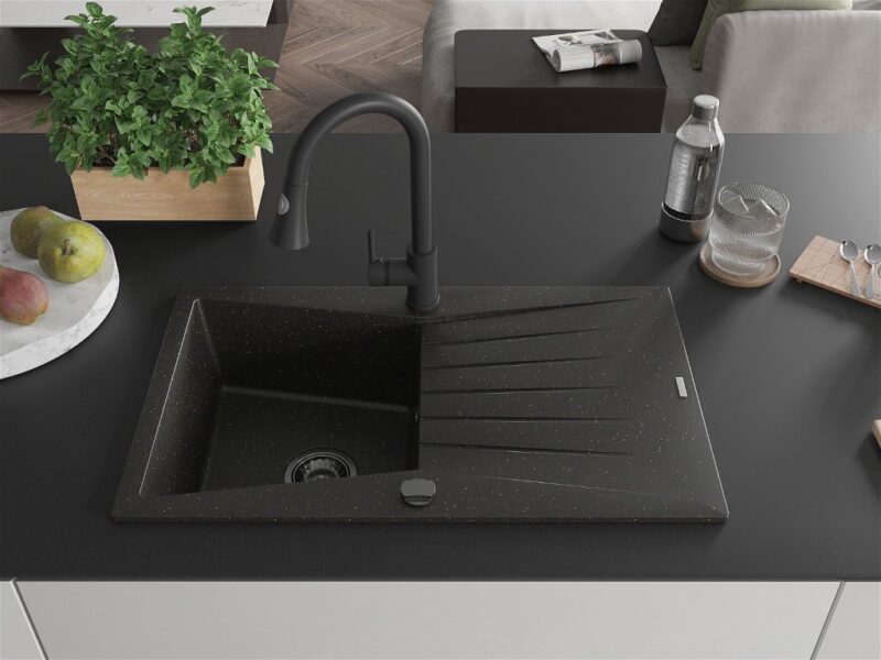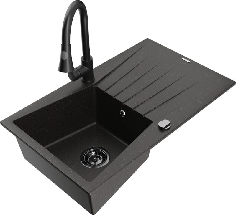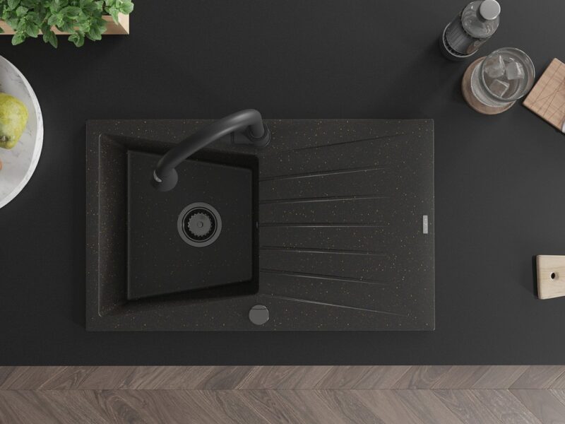 Technické dáta: drez: Rozmer: 775x470x200mm Hĺbka komory: 180 mm Rozmery komory: 410×355 mm Priemer odtoku: ø90 mm Typ: 1-miska s odkvapkávačom Typ: Zapustené do pracovnej dosky Farba: čierna / zlatá metalíza Povrchová úprava sifónu: čierna Materiál: žula (80% žulové kamenivo, 20% živice) Prepadový otvor: Áno Otvory: (batérie, automatické) 2 Inštalácia: Univerzálna, je možné inštalovať s odkvapkávačom na ľavú alebo pravú stranu Vysoká odolnosť proti poškriabaniu a zmene farby Odolnosť proti tepelným šokom Ľahko čistiteľný povrch kuchynská batéria: Materiál: mosadz Čierna farba Hlava: Keramická Prevzdušňovač: Áno Typ: Jedna páka Výška batérie: 380 mm Rozsah výtoku: 252 mm Typ výtoku: Výsuvný(GT) Ean: 5905315030856
