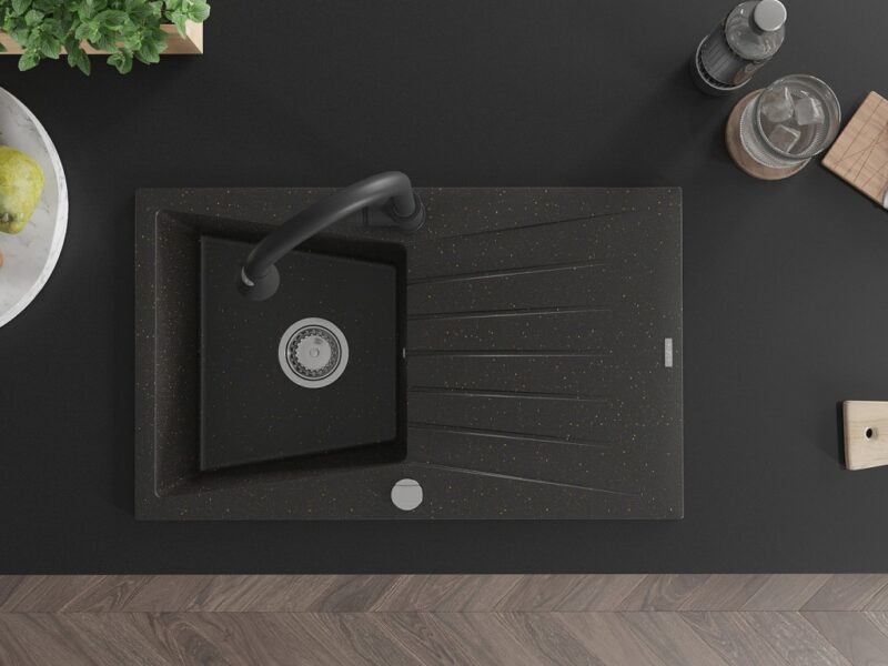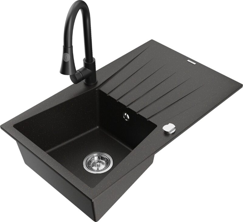 Technické dáta: drez: Rozmer: 775x470x200mm Hĺbka komory: 180 mm Rozmery komory: 410×355 mm Priemer odtoku: ø90 mm Typ: 1-miska s odkvapkávačom Typ: Zapustené do pracovnej dosky Farba: čierna / zlatá metalíza Povrchová úprava sifónu: Chrome Materiál: žula (80% žulové kamenivo, 20% živice) Prepadový otvor: Áno Otvory: (batérie, automatické) 2 Inštalácia: Univerzálna, je možné inštalovať s odkvapkávačom na ľavú alebo pravú stranu Vysoká odolnosť proti poškriabaniu a zmene farby Odolnosť proti tepelným šokom Ľahko čistiteľný povrch kuchynská batéria: Materiál: mosadz Čierna farba Hlava: Keramická Prevzdušňovač: Áno Typ: Jedna páka Výška batérie: 380 mm Rozsah výtoku: 252 mm Typ výtoku: Výsuvný(GT) Ean: 5905315030863