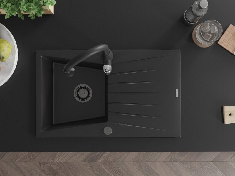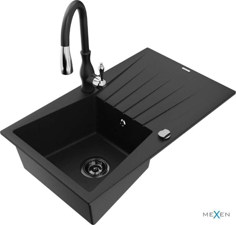 MEXEN/S MEXEN/S – Cesar granitový drez 1 s odkvapkávačom vrátane batérie Savita, čierna 6514-77-672601-70-B