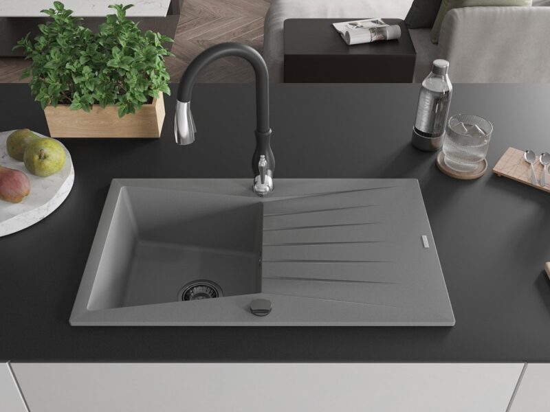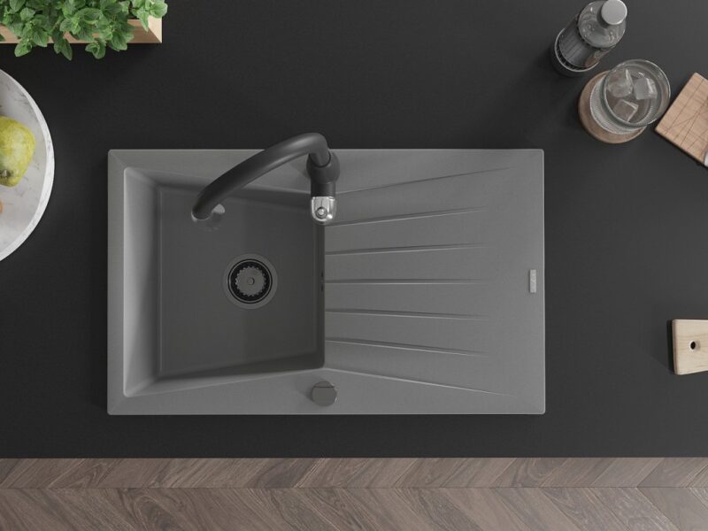 Technické dáta: drez: Rozmer: 775x470x200mm Hĺbka komory: 180 mm Rozmery komory: 410×355 mm Priemer odtoku: ø90 mm Typ: 1-miska s odkvapkávačom Typ: Zapustené do pracovnej dosky Šedá farba Povrchová úprava sifónu: čierna Materiál: žula (80% žulové kamenivo, 20% živice) Prepadový otvor: Áno Otvory: (batérie, automatické) 2 Inštalácia: Univerzálna, je možné inštalovať s odkvapkávačom na ľavú alebo pravú stranu Vysoká odolnosť proti poškriabaniu a zmene farby Odolnosť proti tepelným šokom Ľahko čistiteľný povrch kuchynská batéria: Materiál: mosadz Čierna farba Hlava: Keramická Prevzdušňovač: Áno Typ: Jedna páka Výška batérie: 410 mm Rozsah výtoku: 231 mm(GT) Ean: 5905315035875
