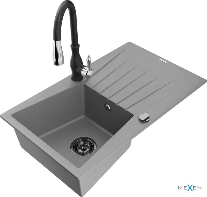 MEXEN/S MEXEN/S – Cesar granitový drez 1 s odkvapkávačom vrátane batérie Savita, šedá 6514-71-672601-70-B