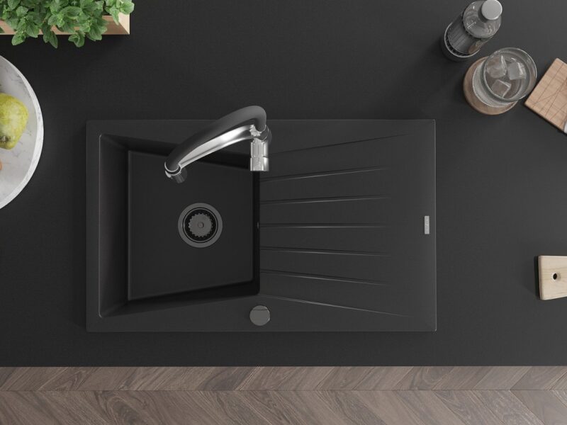 Technické dáta: drez: Rozmer: 775x470x200mm Hĺbka komory: 180 mm Rozmery komory: 410×355 mm Priemer odtoku: ø90 mm Typ: 1-miska s odkvapkávačom Typ: Zapustené do pracovnej dosky Čierna farba Povrchová úprava sifónu: čierna Materiál: žula (80% žulové kamenivo, 20% živice) Prepadový otvor: Áno Otvory: (batérie, automatické) 2 Inštalácia: Univerzálna, je možné inštalovať s odkvapkávačom na ľavú alebo pravú stranu Vysoká odolnosť proti poškriabaniu a zmene farby Odolnosť proti tepelným šokom Ľahko čistiteľný povrch kuchynská batéria: Materiál: mosadz Farba: chróm/čierna Hlava: Keramická Prevzdušňovač: Áno Typ: Jedna páka Výška batérie: 430 mm Rozsah výtoku: 185 mm Batéria má výsuvný výtok(GT) Ean: 5905315047519