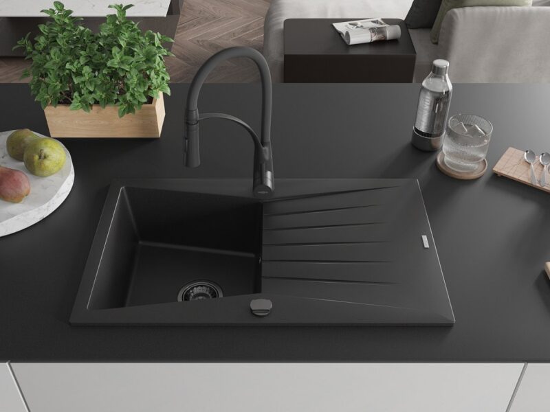 Technické dáta: drez: Rozmer: 775x470x200mm Hĺbka komory: 180 mm Rozmery komory: 410×355 mm Priemer odtoku: ø90 mm Typ: 1-miska s odkvapkávačom Typ: Zapustené do pracovnej dosky Čierna farba Povrchová úprava sifónu: čierna Materiál: žula (80% žulové kamenivo, 20% živice) Prepadový otvor: Áno Otvory: (batérie, automatické) 2 Inštalácia: Univerzálna, je možné inštalovať s odkvapkávačom na ľavú alebo pravú stranu Vysoká odolnosť proti poškriabaniu a zmene farby Odolnosť proti tepelným šokom Ľahko čistiteľný povrch kuchynská batéria: Materiál: mosadz Čierna farba Hlava: Keramická Prevzdušňovač: Áno Typ: Jedna páka Výška batérie: 430 mm Rozsah výtoku: 185 mm Batéria má výsuvný výtok(GT) Ean: 5905315047540