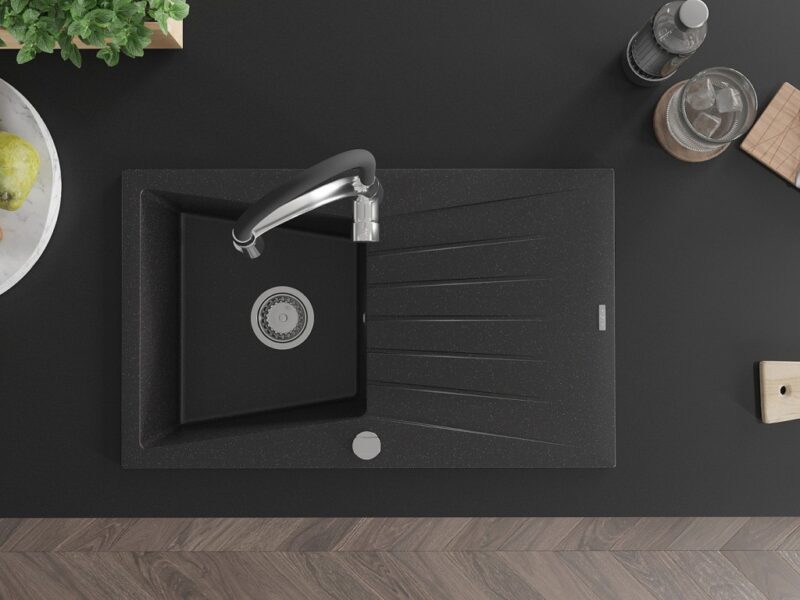 Technické dáta: drez: Rozmer: 775x470x200mm Hĺbka komory: 180 mm Rozmery komory: 410×355 mm Priemer odtoku: ø90 mm Typ: 1-miska s odkvapkávačom Typ: Zapustené do pracovnej dosky Farba: čierna/strieborná metalíza Povrchová úprava sifónu: Chrome Materiál: žula (80% žulové kamenivo, 20% živice) Prepadový otvor: Áno Otvory: (batérie, automatické) 2 Inštalácia: Univerzálna, je možné inštalovať s odkvapkávačom na ľavú alebo pravú stranu Vysoká odolnosť proti poškriabaniu a zmene farby Odolnosť proti tepelným šokom Ľahko čistiteľný povrch kuchynská batéria: Materiál: mosadz Farba: chróm/čierna Hlava: Keramická Prevzdušňovač: Áno Typ: Jedna páka Výška batérie: 430 mm Rozsah výtoku: 185 mm Batéria má výsuvný výtok(GT) Ean: 5905315047328
