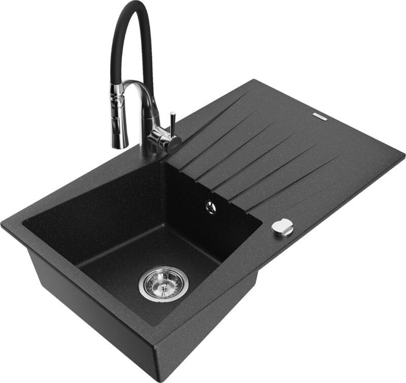 MEXEN/S MEXEN/S – Cesar granitový drez s odkvapkávačom vrátane batérie Aster, čierna/strieborná metalík 6514-73-73450-07