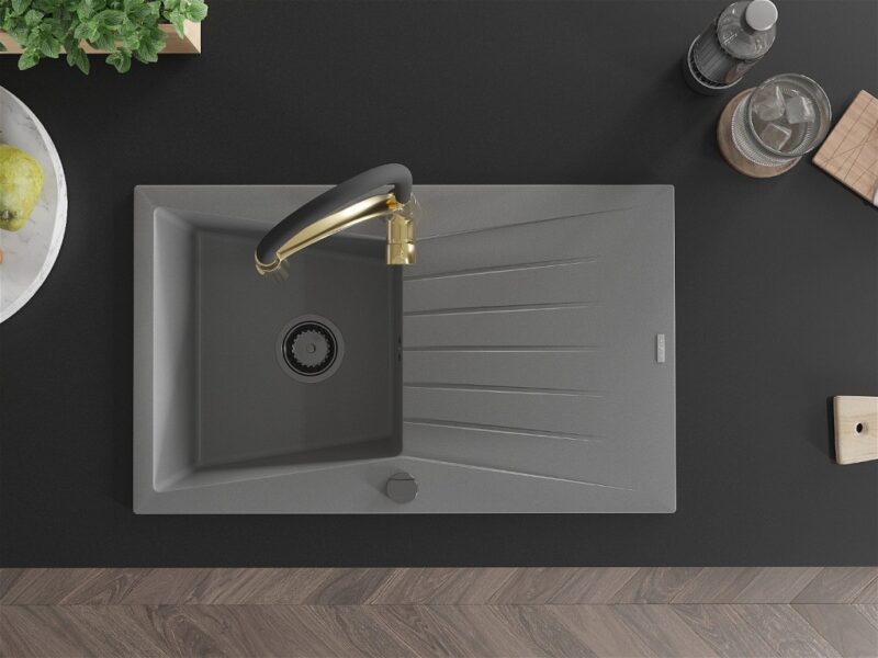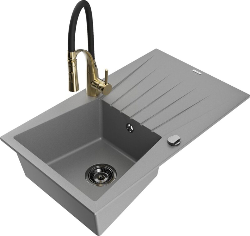 Technické dáta: drez: Rozmer: 775x470x200mm Hĺbka komory: 180 mm Rozmery komory: 410×355 mm Priemer odtoku: ø90 mm Typ: 1-miska s odkvapkávačom Typ: Zapustené do pracovnej dosky Šedá farba Povrchová úprava sifónu: čierna Materiál: žula (80% žulové kamenivo, 20% živice) Prepadový otvor: Áno Otvory: (batérie, automatické) 2 Inštalácia: Univerzálna, je možné inštalovať s odkvapkávačom na ľavú alebo pravú stranu Vysoká odolnosť proti poškriabaniu a zmene farby Odolnosť proti tepelným šokom Ľahko čistiteľný povrch kuchynská batéria: Materiál: mosadz Farba: Zlatá/Čierna Hlava: Keramická Prevzdušňovač: Áno Typ: Jedna páka Výška batérie: 430 mm Rozsah výtoku: 185 mm Batéria má výsuvný výtok(GT) Ean: 5905315047298