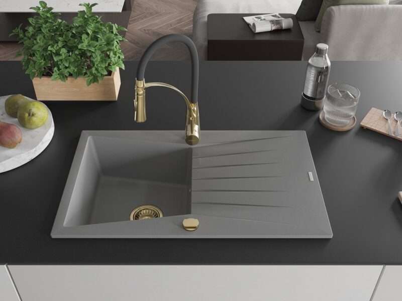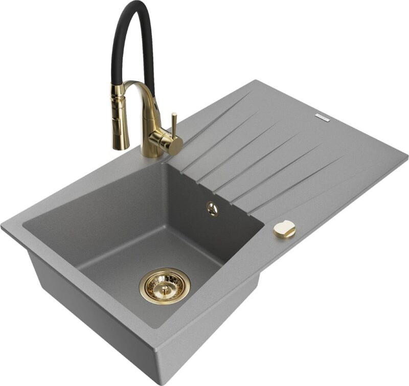 Technické dáta: drez: Rozmer: 775x470x200mm Hĺbka komory: 180 mm Rozmery komory: 410×355 mm Priemer odtoku: ø90 mm Typ: 1-miska s odkvapkávačom Typ: Zapustené do pracovnej dosky Šedá farba Povrchová úprava sifónu: zlatá Materiál: žula (80% žulové kamenivo, 20% živice) Prepadový otvor: Áno Otvory: (batérie, automatické) 2 Inštalácia: Univerzálna, je možné inštalovať s odkvapkávačom na ľavú alebo pravú stranu Vysoká odolnosť proti poškriabaniu a zmene farby Odolnosť proti tepelným šokom Ľahko čistiteľný povrch kuchynská batéria: Materiál: mosadz Farba: Zlatá/Čierna Hlava: Keramická Prevzdušňovač: Áno Typ: Jedna páka Výška batérie: 430 mm Rozsah výtoku: 185 mm Batéria má výsuvný výtok(GT) Ean: 5905315047281