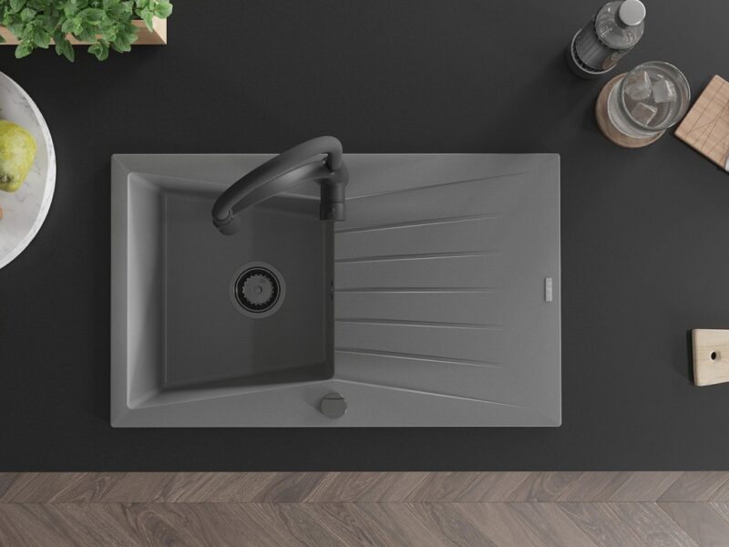 Technické dáta: drez: Rozmer: 775x470x200mm Hĺbka komory: 180 mm Rozmery komory: 410×355 mm Priemer odtoku: ø90 mm Typ: 1-miska s odkvapkávačom Typ: Zapustené do pracovnej dosky Šedá farba Povrchová úprava sifónu: čierna Materiál: žula (80% žulové kamenivo, 20% živice) Prepadový otvor: Áno Otvory: (batérie, automatické) 2 Inštalácia: Univerzálna, je možné inštalovať s odkvapkávačom na ľavú alebo pravú stranu Vysoká odolnosť proti poškriabaniu a zmene farby Odolnosť proti tepelným šokom Ľahko čistiteľný povrch kuchynská batéria: Materiál: mosadz Čierna farba Hlava: Keramická Prevzdušňovač: Áno Typ: Jedna páka Výška batérie: 430 mm Rozsah výtoku: 185 mm Batéria má výsuvný výtok(GT) Ean: 5905315047304