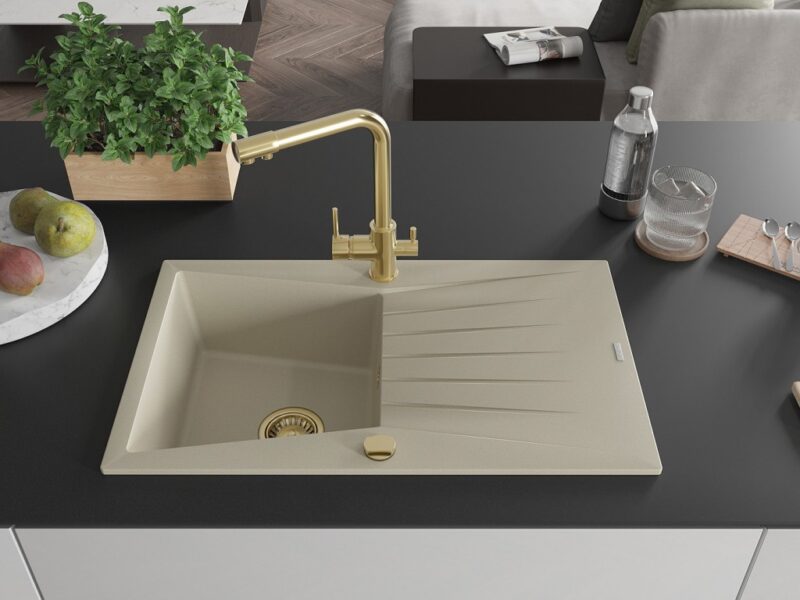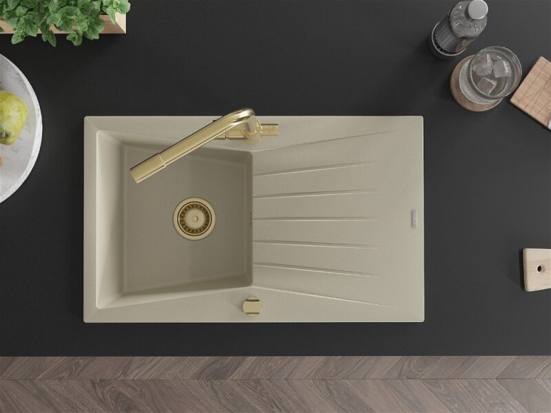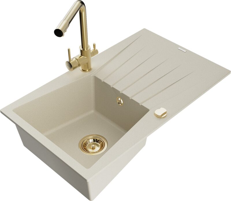 Technické dáta: drez: Rozmer: 775x470x200mm Hĺbka komory: 180 mm Rozmery komory: 410×355 mm Priemer odtoku: ø90 mm Typ: 1-miska s odkvapkávačom Typ: Zapustené do pracovnej dosky Farba béžová Povrchová úprava sifónu: zlatá Materiál: žula (80% žulové kamenivo, 20% živice) Prepadový otvor: Áno Otvory: (batérie, automatické) 2 Inštalácia: Univerzálna, je možné inštalovať s odkvapkávačom na ľavú alebo pravú stranu Vysoká odolnosť proti poškriabaniu a zmene farby Odolnosť proti tepelným šokom Ľahko čistiteľný povrch kuchynská batéria: Materiál: mosadz Farba: Zlatá Hlava: Keramická Prevzdušňovač: Áno Typ: Dve rukoväte Rozsah výtoku: 235 mm Výška batérie: 315 mm Dvojhlavá batéria s prídavným kanálom pre filtrovanú pitnú vodu(GT) Ean: 5905315025593