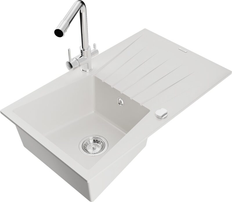 Technické dáta: drez: Rozmer: 775x470x200mm Hĺbka komory: 180 mm Rozmery komory: 410×355 mm Priemer odtoku: ø90 mm Typ: 1-miska s odkvapkávačom Typ: Zapustené do pracovnej dosky biela farba Povrchová úprava sifónu: Chrome Materiál: žula (80% žulové kamenivo, 20% živice) Prepadový otvor: Áno Otvory: (batérie, automatické) 2 Inštalácia: Univerzálna, je možné inštalovať s odkvapkávačom na ľavú alebo pravú stranu Vysoká odolnosť proti poškriabaniu a zmene farby Odolnosť proti tepelným šokom Ľahko čistiteľný povrch kuchynská batéria: Materiál: mosadz Farba: Chrome Hlava: Keramická Prevzdušňovač: Áno Typ: Dve rukoväte Rozsah výtoku: 235 mm Výška batérie: 315 mm Dvojhlavá batéria s prídavným kanálom pre filtrovanú pitnú vodu(GT) Ean: 5905315025531