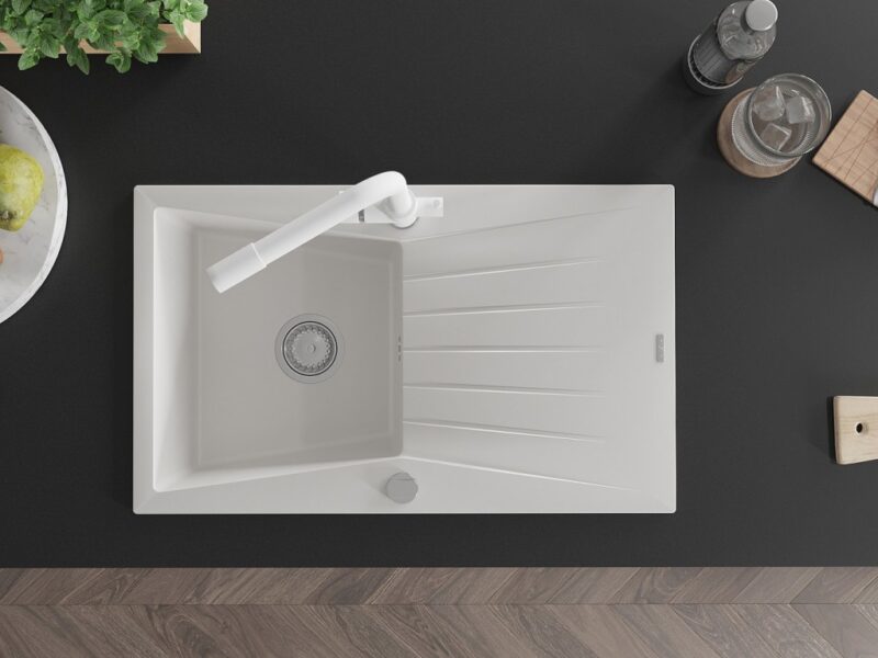 Technické dáta: drez: Rozmer: 775x470x200mm Hĺbka komory: 180 mm Rozmery komory: 410×355 mm Priemer odtoku: ø90 mm Typ: 1-miska s odkvapkávačom Typ: Zapustené do pracovnej dosky biela farba Povrchová úprava sifónu: Chrome Materiál: žula (80% žulové kamenivo, 20% živice) Prepadový otvor: Áno Otvory: (batérie, automatické) 2 Inštalácia: Univerzálna, je možné inštalovať s odkvapkávačom na ľavú alebo pravú stranu Vysoká odolnosť proti poškriabaniu a zmene farby Odolnosť proti tepelným šokom Ľahko čistiteľný povrch kuchynská batéria: Materiál: mosadz biela farba Hlava: Keramická Prevzdušňovač: Áno Typ: Dve rukoväte Rozsah výtoku: 235 mm Výška batérie: 315 mm Dvojhlavá batéria s prídavným kanálom pre filtrovanú pitnú vodu(GT) Ean: 5905315025548