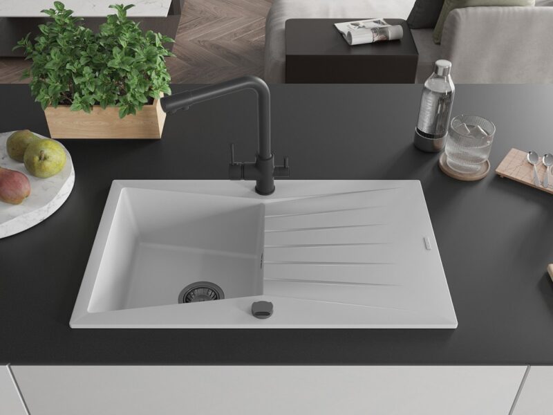 Technické dáta: drez: Rozmer: 775x470x200mm Hĺbka komory: 180 mm Rozmery komory: 410×355 mm Priemer odtoku: ø90 mm Typ: 1-miska s odkvapkávačom Typ: Zapustené do pracovnej dosky biela farba Povrchová úprava sifónu: čierna Materiál: žula (80% žulové kamenivo, 20% živice) Prepadový otvor: Áno Otvory: (batérie, automatické) 2 Inštalácia: Univerzálna, je možné inštalovať s odkvapkávačom na ľavú alebo pravú stranu Vysoká odolnosť proti poškriabaniu a zmene farby Odolnosť proti tepelným šokom Ľahko čistiteľný povrch kuchynská batéria: Materiál: mosadz Čierna farba Hlava: Keramická Prevzdušňovač: Áno Typ: Dve rukoväte Rozsah výtoku: 235 mm Výška batérie: 315 mm Dvojhlavá batéria s prídavným kanálom pre filtrovanú pitnú vodu(GT) Ean: 5905315025562