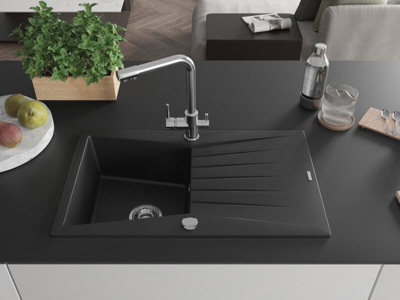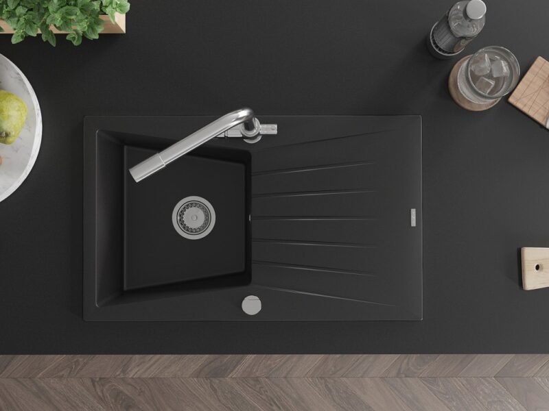 Technické dáta: drez: Rozmer: 775x470x200mm Hĺbka komory: 180 mm Rozmery komory: 410×355 mm Priemer odtoku: ø90 mm Typ: 1-miska s odkvapkávačom Typ: Zapustené do pracovnej dosky Čierna farba Povrchová úprava sifónu: Chrome Materiál: žula (80% žulové kamenivo, 20% živice) Prepadový otvor: Áno Otvory: (batérie, automatické) 2 Inštalácia: Univerzálna, je možné inštalovať s odkvapkávačom na ľavú alebo pravú stranu Vysoká odolnosť proti poškriabaniu a zmene farby Odolnosť proti tepelným šokom Ľahko čistiteľný povrch kuchynská batéria: Materiál: mosadz Farba: Chrome Hlava: Keramická Prevzdušňovač: Áno Typ: Dve rukoväte Rozsah výtoku: 235 mm Výška batérie: 315 mm Dvojhlavá batéria s prídavným kanálom pre filtrovanú pitnú vodu(GT) Ean: 5905315025807
