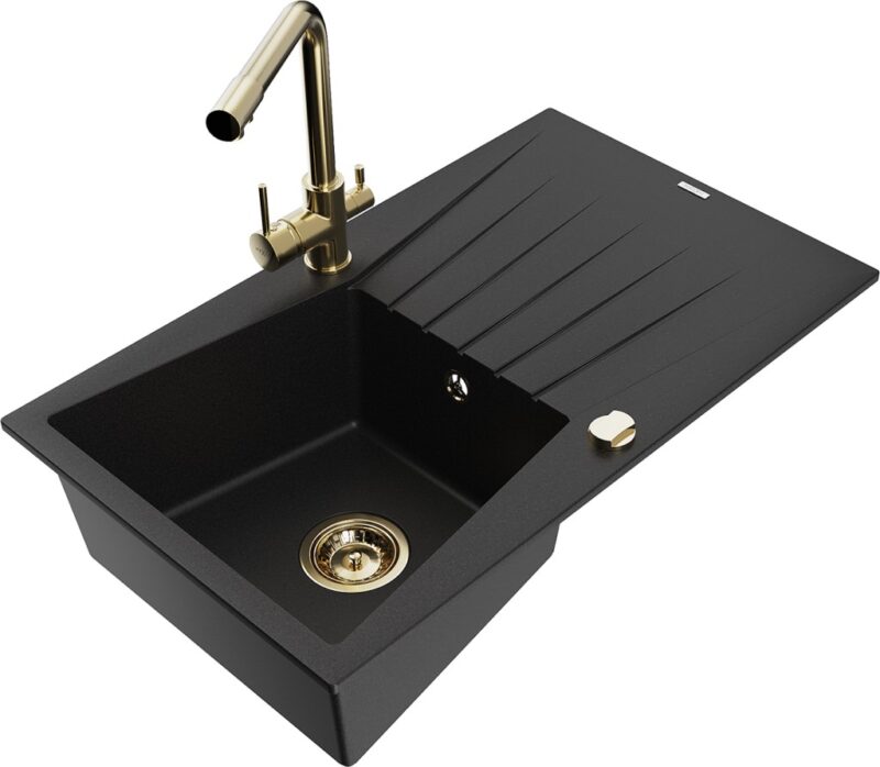Technické dáta: drez: Rozmer: 775x470x200mm Hĺbka komory: 180 mm Rozmery komory: 410×355 mm Priemer odtoku: ø90 mm Typ: 1-miska s odkvapkávačom Typ: Zapustené do pracovnej dosky Čierna farba Povrchová úprava sifónu: zlatá Materiál: žula (80% žulové kamenivo, 20% živice) Prepadový otvor: Áno Otvory: (batérie, automatické) 2 Inštalácia: Univerzálna, je možné inštalovať s odkvapkávačom na ľavú alebo pravú stranu Vysoká odolnosť proti poškriabaniu a zmene farby Odolnosť proti tepelným šokom Ľahko čistiteľný povrch kuchynská batéria: Materiál: mosadz Farba: Zlatá Hlava: Keramická Prevzdušňovač: Áno Typ: Dve rukoväte Rozsah výtoku: 235 mm Výška batérie: 315 mm Dvojhlavá batéria s prídavným kanálom pre filtrovanú pitnú vodu(GT) Ean: 5905315025814