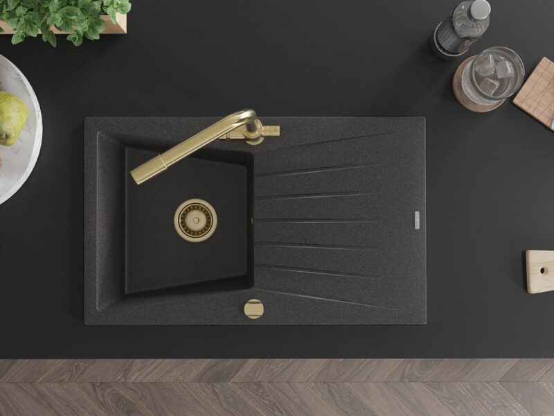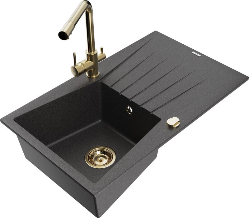 Technické dáta: drez: Rozmer: 775x470x200mm Hĺbka komory: 180 mm Rozmery komory: 410×355 mm Priemer odtoku: ø90 mm Typ: 1-miska s odkvapkávačom Typ: Zapustené do pracovnej dosky Farba: Škvrnitá čierna Povrchová úprava sifónu: zlatá Materiál: žula (80% žulové kamenivo, 20% živice) Prepadový otvor: Áno Otvory: (batérie, automatické) 2 Inštalácia: Univerzálna, je možné inštalovať s odkvapkávačom na ľavú alebo pravú stranu Vysoká odolnosť proti poškriabaniu a zmene farby Odolnosť proti tepelným šokom Ľahko čistiteľný povrch kuchynská batéria: Materiál: mosadz Farba: Zlatá Hlava: Keramická Prevzdušňovač: Áno Typ: Dve rukoväte Rozsah výtoku: 235 mm Výška batérie: 315 mm Dvojhlavá batéria s prídavným kanálom pre filtrovanú pitnú vodu(GT) Ean: 5905315025760