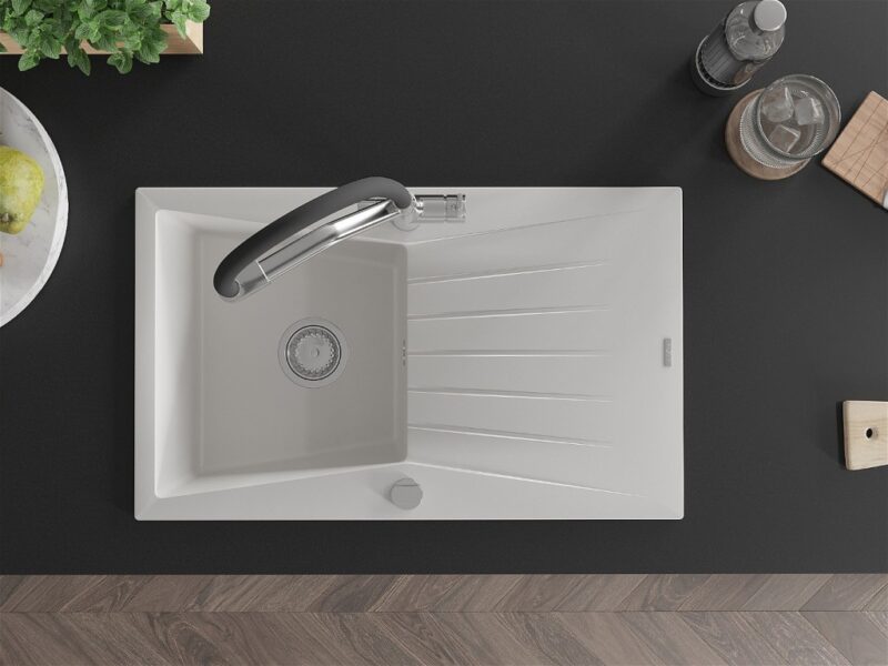 Technické dáta: drez: Rozmer: 775x470x200mm Hĺbka komory: 180 mm Rozmery komory: 410×355 mm Priemer odtoku: ø90 mm Typ: 1-miska s odkvapkávačom Typ: Zapustené do pracovnej dosky biela farba Povrchová úprava sifónu: Chrome Materiál: žula (80% žulové kamenivo, 20% živice) Prepadový otvor: Áno Otvory: (batérie, automatické) 2 Inštalácia: Univerzálna, je možné inštalovať s odkvapkávačom na ľavú alebo pravú stranu Vysoká odolnosť proti poškriabaniu a zmene farby Odolnosť proti tepelným šokom Ľahko čistiteľný povrch kuchynská batéria: Materiál: mosadz Farba: chróm/čierna Hlavy: Keramické Prevzdušňovač: Áno Typ hubica: Flexibilný s mosadzným držiakom Rozsah výtoku: 260 mm Výška: 405 mm Typ: Dve rukoväte Dvojhlavá batéria s prídavným filtrom na pitnú vodu(GT) Ean: 5905315102256