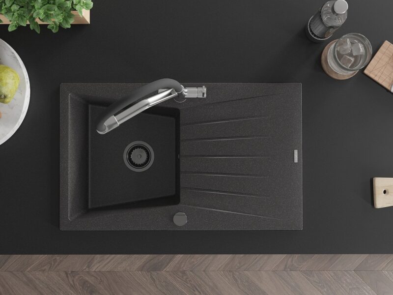 Technické dáta: drez: Rozmer: 775x470x200mm Hĺbka komory: 180 mm Rozmery komory: 410×355 mm Priemer odtoku: ø90 mm Typ: 1-miska s odkvapkávačom Typ: Zapustené do pracovnej dosky Farba: Škvrnitá čierna Povrchová úprava sifónu: čierna Materiál: žula (80% žulové kamenivo, 20% živice) Prepadový otvor: Áno Otvory: (batérie, automatické) 2 Inštalácia: Univerzálna, je možné inštalovať s odkvapkávačom na ľavú alebo pravú stranu Vysoká odolnosť proti poškriabaniu a zmene farby Odolnosť proti tepelným šokom Ľahko čistiteľný povrch kuchynská batéria: Materiál: mosadz Farba: chróm/čierna Hlavy: Keramické Prevzdušňovač: Áno Typ hubica: Flexibilný s mosadzným držiakom Rozsah výtoku: 260 mm Výška: 405 mm Typ: Dve rukoväte Dvojhlavá batéria s prídavným filtrom na pitnú vodu(GT) Ean: 5905315102515