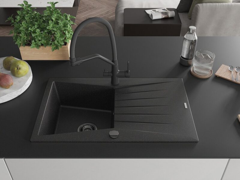 Technické dáta: drez: Rozmer: 775x470x200mm Hĺbka komory: 180 mm Rozmery komory: 410×355 mm Priemer odtoku: ø90 mm Typ: 1-miska s odkvapkávačom Typ: Zapustené do pracovnej dosky Farba: čierna/strieborná metalíza Povrchová úprava sifónu: čierna Materiál: žula (80% žulové kamenivo, 20% živice) Prepadový otvor: Áno Otvory: (batérie, automatické) 2 Inštalácia: Univerzálna, je možné inštalovať s odkvapkávačom na ľavú alebo pravú stranu Vysoká odolnosť proti poškriabaniu a zmene farby Odolnosť proti tepelným šokom Ľahko čistiteľný povrch kuchynská batéria: Materiál: mosadz Čierna farba Hlavy: Keramické Prevzdušňovač: Áno Typ hubica: Flexibilný s mosadzným držiakom Rozsah výtoku: 260 mm Výška: 405 mm Typ: Dve rukoväte Dvojhlavá batéria s prídavným filtrom na pitnú vodu(GT) Ean: 5905315102447