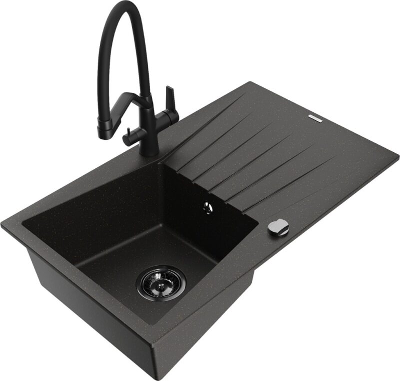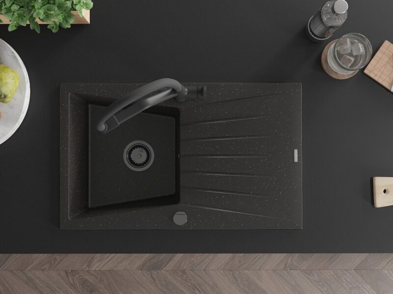 Technické dáta: drez: Rozmer: 775x470x200mm Hĺbka komory: 180 mm Rozmery komory: 410×355 mm Priemer odtoku: ø90 mm Typ: 1-miska s odkvapkávačom Typ: Zapustené do pracovnej dosky Farba: čierna / zlatá metalíza Povrchová úprava sifónu: čierna Materiál: žula (80% žulové kamenivo, 20% živice) Prepadový otvor: Áno Otvory: (batérie, automatické) 2 Inštalácia: Univerzálna, je možné inštalovať s odkvapkávačom na ľavú alebo pravú stranu Vysoká odolnosť proti poškriabaniu a zmene farby Odolnosť proti tepelným šokom Ľahko čistiteľný povrch kuchynská batéria: Materiál: mosadz Čierna farba Hlavy: Keramické Prevzdušňovač: Áno Typ hubica: Flexibilný s mosadzným držiakom Rozsah výtoku: 260 mm Výška: 405 mm Typ: Dve rukoväte Dvojhlavá batéria s prídavným filtrom na pitnú vodu(GT) Ean: 5905315102492