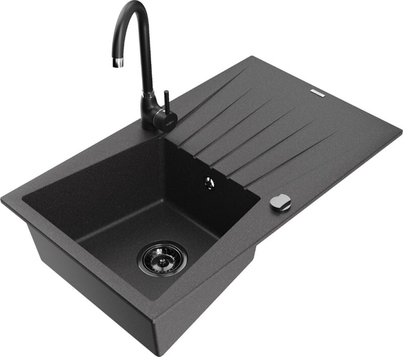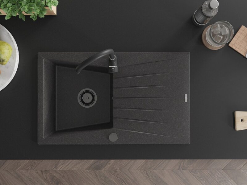 Technické dáta: drez: Rozmer: 775x470x200mm Hĺbka komory: 180 mm Rozmery komory: 410×355 mm Priemer odtoku: ø90 mm Typ: 1-miska s odkvapkávačom Typ: Zapustené do pracovnej dosky Farba: Škvrnitá čierna Povrchová úprava sifónu: čierna Materiál: žula (80% žulové kamenivo, 20% živice) Prepadový otvor: Áno Otvory: (batérie, automatické) 2 Inštalácia: Univerzálna, je možné inštalovať s odkvapkávačom na ľavú alebo pravú stranu Vysoká odolnosť proti poškriabaniu a zmene farby Odolnosť proti tepelným šokom Ľahko čistiteľný povrch kuchynská batéria: Materiál: mosadz Čierna farba Hlava: Keramická Prevzdušňovač: Áno Typ: Jedna páka Výška batérie: 335 mm Rozsah výtoku: 180 mm(GT) Ean: 5905315015730