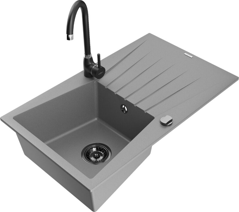 Technické dáta: drez: Rozmer: 775x470x200mm Hĺbka komory: 180 mm Rozmery komory: 410×355 mm Priemer odtoku: ø90 mm Typ: 1-miska s odkvapkávačom Typ: Zapustené do pracovnej dosky Šedá farba Povrchová úprava sifónu: čierna Materiál: žula (80% žulové kamenivo, 20% živice) Prepadový otvor: Áno Otvory: (batérie, automatické) 2 Inštalácia: Univerzálna, je možné inštalovať s odkvapkávačom na ľavú alebo pravú stranu Vysoká odolnosť proti poškriabaniu a zmene farby Odolnosť proti tepelným šokom Ľahko čistiteľný povrch kuchynská batéria: Materiál: mosadz Čierna farba Hlava: Keramická Prevzdušňovač: Áno Typ: Jedna páka Výška batérie: 335 mm Rozsah výtoku: 180 mm(GT) Ean: 5905315015655