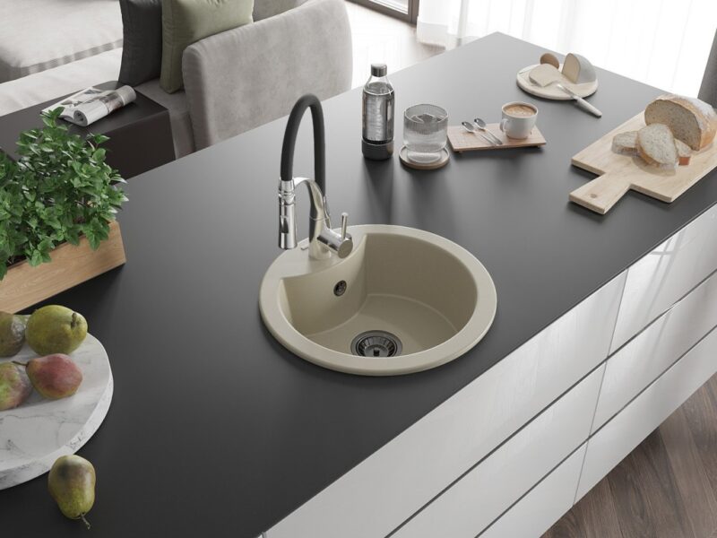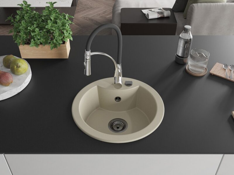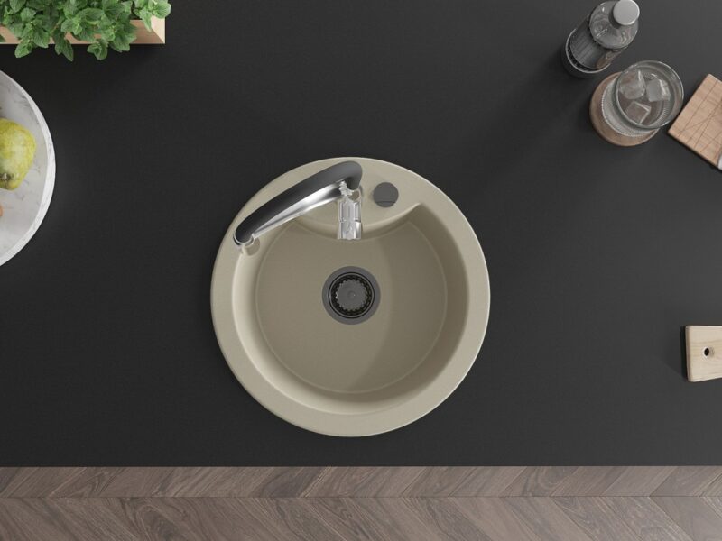 Technické dáta: Drez: Rozmer: 488x488x167 mm Hĺbka komory: 157 mm Šírka komory: 406 mm Priemer odtoku: ø90 mm Typ: 1-komorový Typ: Zapustené do pracovnej dosky Farba béžová Povrchová úprava sifónu: čierna Materiál: žula (80% žulové kamenivo 20% živice) Prepadový otvor: Áno Otvory: (batérie, automat) 2 Vysoká odolnosť proti poškriabaniu a zmene farby Odolnosť proti tepelným šokom Povrch pre ľahké čistenie Jeden dodatočný vyfrézovaný otvor na samodierovanie ø35 Kuchynská batéria: Materiál: mosadz Farba: chróm/čierna Hlava: Keramická Perlátor: Áno Typ výtoku: Flexibilný s mosadznou podperou Typ: Jednopákové Výška batérie: 430 mm Rozsah výtoku: 235 mm(GT) Ean: 5905315046376