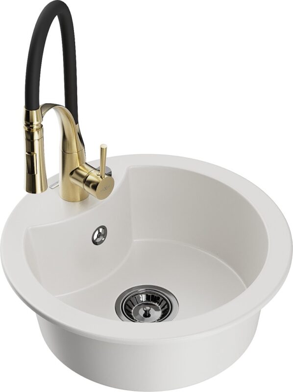 Technické dáta: drez: Rozmery: 488 x 488 x 167 mm Hĺbka komory: 157 mm Šírka komory: 406 mm Priemer odtoku: ø90 mm Typ: 1-komorový Typ: Zapustené do pracovnej dosky biela farba Povrchová úprava sifónu: čierna Materiál: žula (80% žulové kamenivo, 20% živice) Prepadový otvor: Áno Otvory: (batérie, automatické) 2 Vysoká odolnosť proti poškriabaniu a zmene farby Odolnosť proti tepelným šokom Ľahko čistiteľný povrch Jeden dodatočný vyfrézovaný otvor na samodierovanie ø35 kuchynská batéria: Materiál: mosadz Farba: Zlatá/Čierna Hlava: Keramická Prevzdušňovač: Áno Typ: Jedna páka Výška batérie: 430 mm Rozsah výtoku: 185 mm Batéria má výsuvný výtok(GT) Ean: 5905315046338