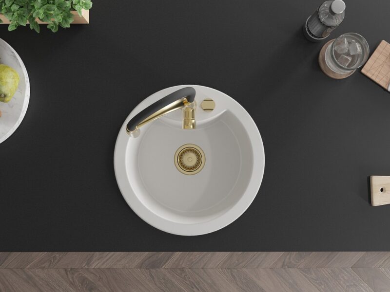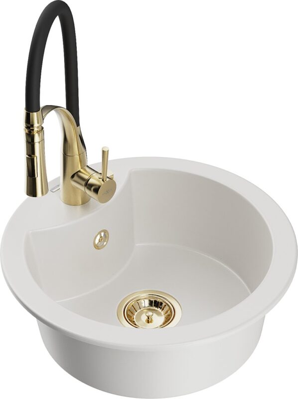 Technické dáta: drez: Rozmery: 488 x 488 x 167 mm Hĺbka komory: 157 mm Šírka komory: 406 mm Priemer odtoku: ø90 mm Typ: 1-komorový Typ: Zapustené do pracovnej dosky biela farba Povrchová úprava sifónu: zlatá Materiál: žula (80% žulové kamenivo, 20% živice) Prepadový otvor: Áno Otvory: (batérie, automatické) 2 Vysoká odolnosť proti poškriabaniu a zmene farby Odolnosť proti tepelným šokom Ľahko čistiteľný povrch Jeden dodatočný vyfrézovaný otvor na samodierovanie ø35 kuchynská batéria: Materiál: mosadz Farba: Zlatá/Čierna Hlava: Keramická Prevzdušňovač: Áno Typ: Jedna páka Výška batérie: 430 mm Rozsah výtoku: 185 mm Batéria má výsuvný výtok(GT) Ean: 5905315046321