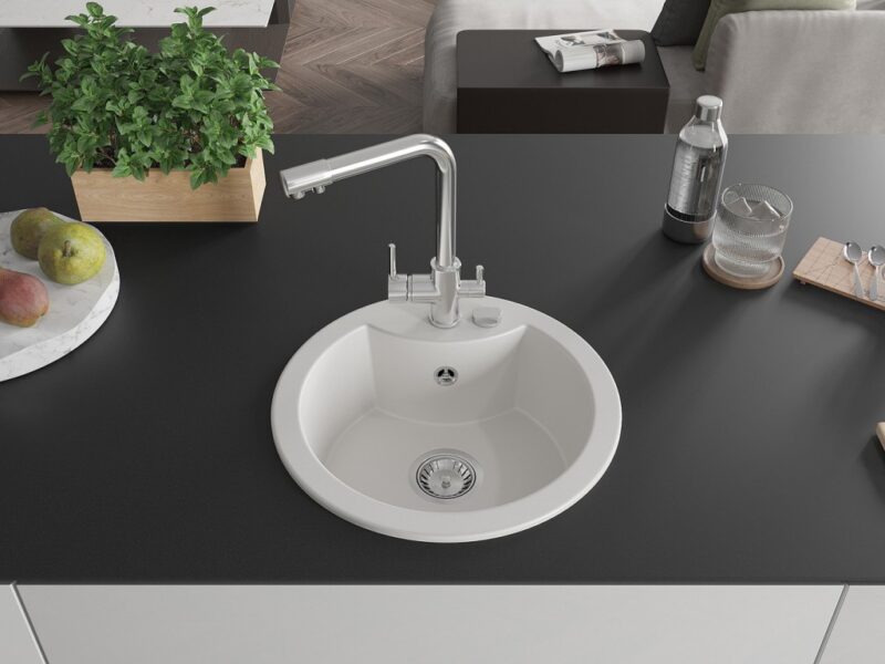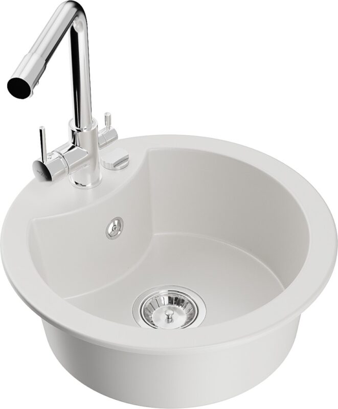 Technické dáta: drez: Rozmery: 488 x 488 x 167 mm Hĺbka komory: 157 mm Šírka komory: 406 mm Priemer odtoku: ø90 mm Typ: 1-komorový Typ: Zapustené do pracovnej dosky biela farba Povrchová úprava sifónu: Chrome Materiál: žula (80% žulové kamenivo, 20% živice) Prepadový otvor: Áno Otvory: (batérie, automatické) 2 Vysoká odolnosť proti poškriabaniu a zmene farby Odolnosť proti tepelným šokom Ľahko čistiteľný povrch Jeden dodatočný vyfrézovaný otvor na samodierovanie ø35 kuchynská batéria: Materiál: mosadz Farba: Chrome Hlava: Keramická Prevzdušňovač: Áno Typ: Dve rukoväte Rozsah výtoku: 235 mm Výška batérie: 315 mm Dvojhlavá batéria s prídavným kanálom pre filtrovanú pitnú vodu(GT) Ean: 5905315024893