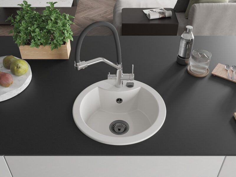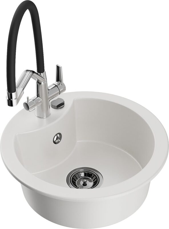 Technické dáta: drez: Rozmery: 488 x 488 x 167 mm Hĺbka komory: 157 mm Šírka komory: 406 mm Priemer odtoku: ø90 mm Typ: 1-komorový Typ: Zapustené do pracovnej dosky biela farba Povrchová úprava sifónu: čierna Materiál: žula (80% žulové kamenivo, 20% živice) Prepadový otvor: Áno Otvory: (batérie, automatické) 2 Vysoká odolnosť proti poškriabaniu a zmene farby Odolnosť proti tepelným šokom Ľahko čistiteľný povrch Jeden dodatočný vyfrézovaný otvor na samodierovanie ø35 kuchynská batéria: Materiál: mosadz Farba: chróm/čierna Hlavy: Keramické Prevzdušňovač: Áno Typ hubica: Flexibilný s mosadzným držiakom Rozsah výtoku: 260 mm Výška: 405 mm Typ: Dve rukoväte Dvojhlavá batéria s prídavným filtrom na pitnú vodu(GT) Ean: 5905315101549